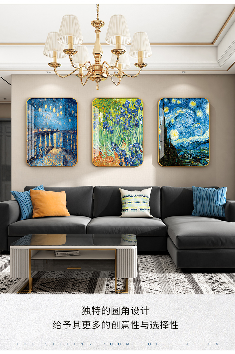紀恒ふわふわのゴッホ装飾画世界名画居間ソファの壁に欧風の暖かい円角三連画の見本板間のロマンチックな雰囲気の壁画高級なライト贅沢な風景の壁画D-星空いっぱいの枠-金色のアルミニウム合金フレーム50*70 cm(2.5メートルぐらいのソファーに適しています)を掛けました。