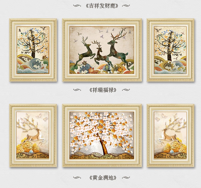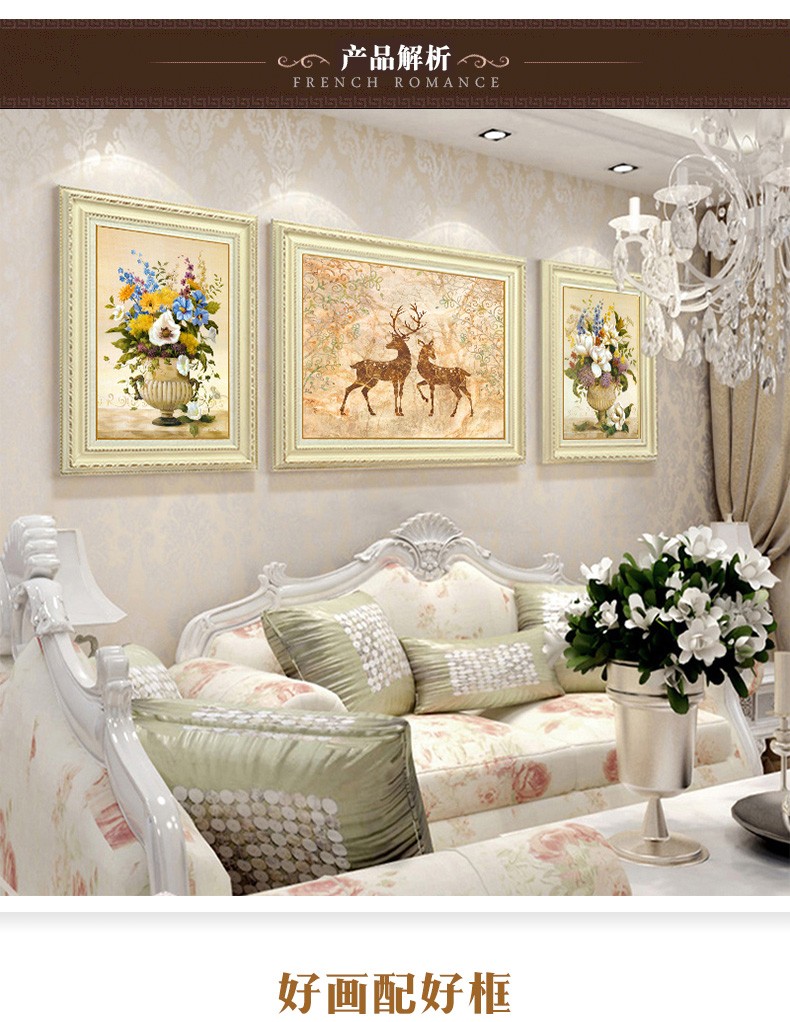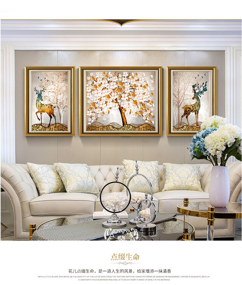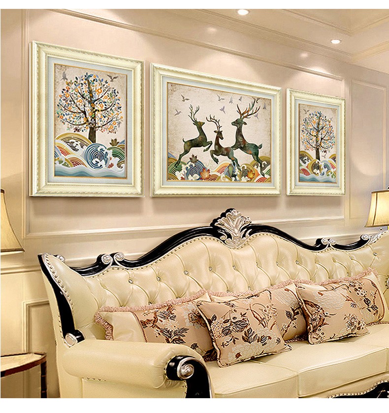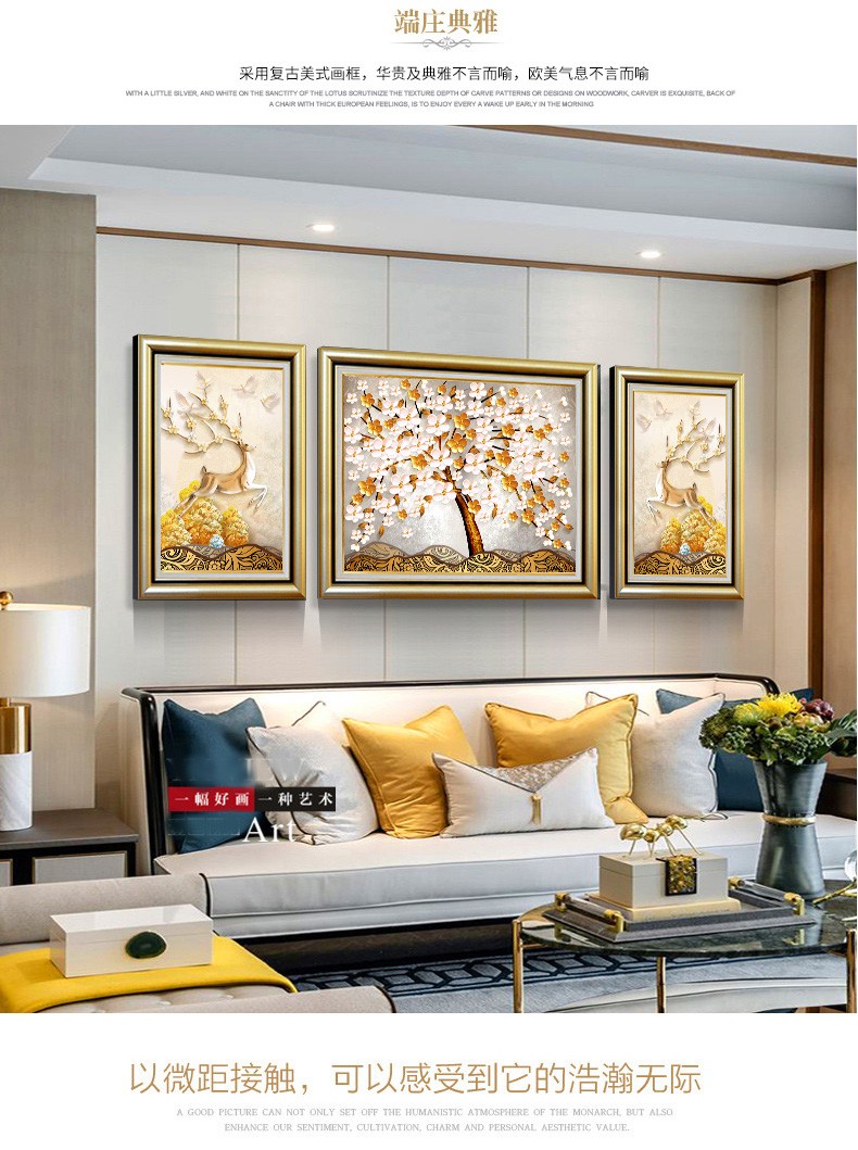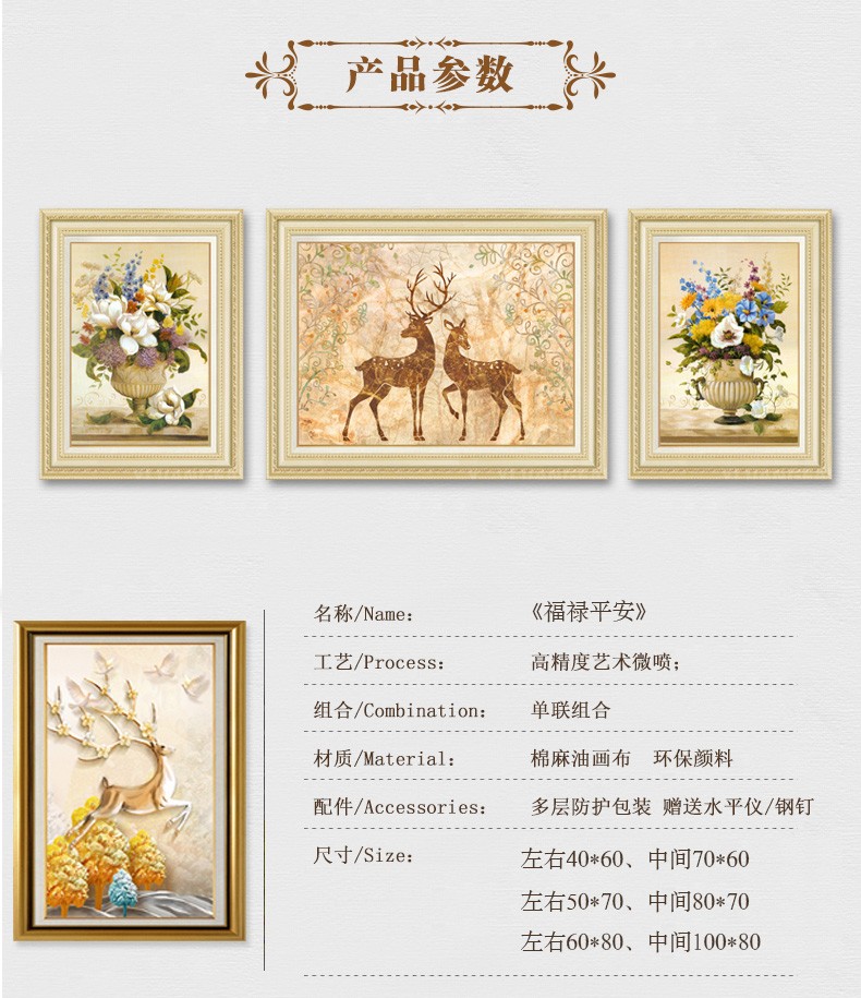 | 商品名称 | 晴画意欧式客間装飾画北欧軽奢ソファ背景画寝室暖かい三連壁画レストランの背景壁掛画福禄平安【おすすめ】のセット(50*70中央100*70) |