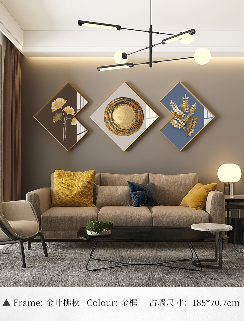 | 商品名称 | 紀恒軟らかい現代の軽奢な背景壁装飾画客間ソファの後ろの掛画晶磁器の画家は室内の三連を入れて簡単に大気ホールの創意壁画壁面の北欧の風壁画の金葉が秋に吹く(中サイズ:220*84.8 cm)金色の糸を引くアルミニウム合金フレーム |
