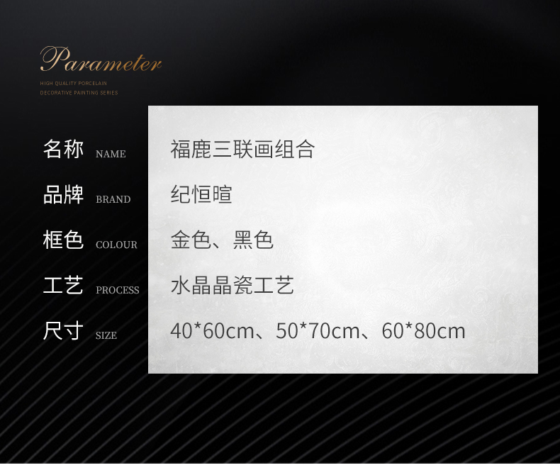 | 商品名称 | 紀恒軟客間装飾画ソファーの背景壁壁画新中国式招財のための鹿三連掛画家の別荘ソフト装飾壁画創意簡単現代晶磁器画壁画直角画-福鹿生財-金色枠60*80 cm(3.5メートルぐらいのソファーに適しています) |