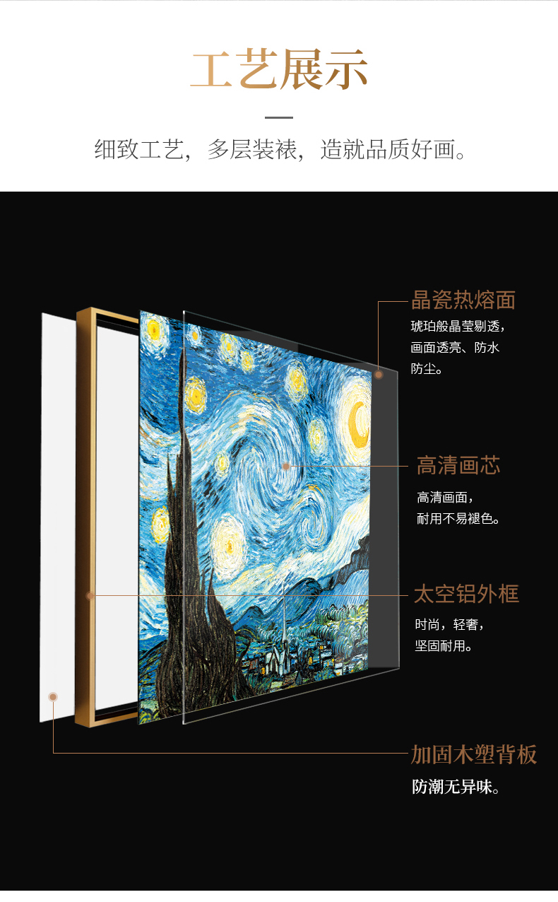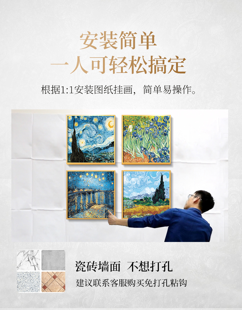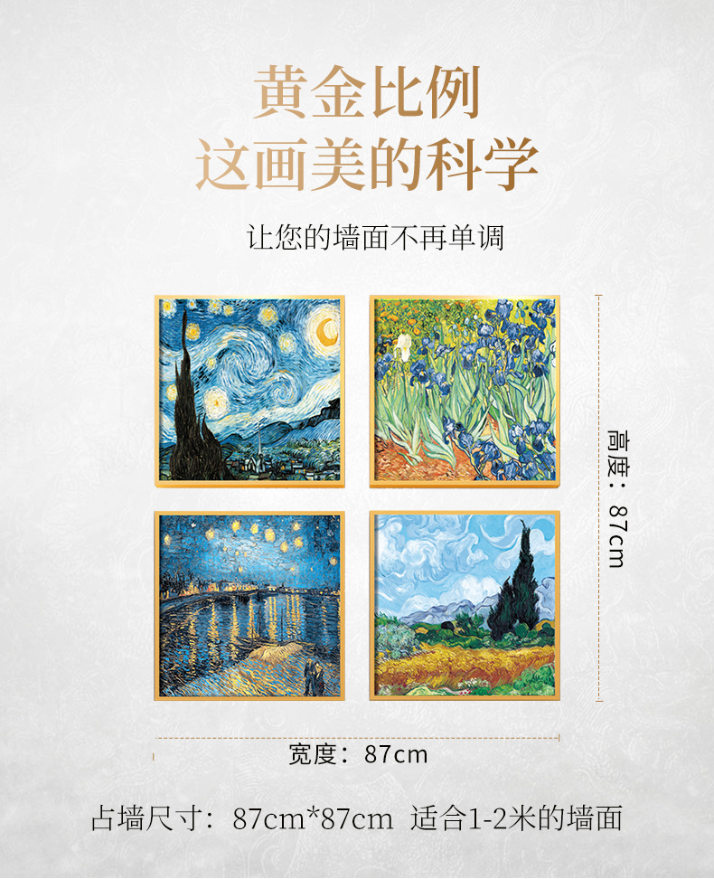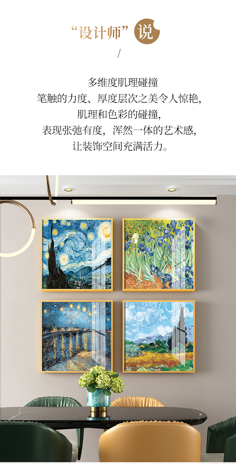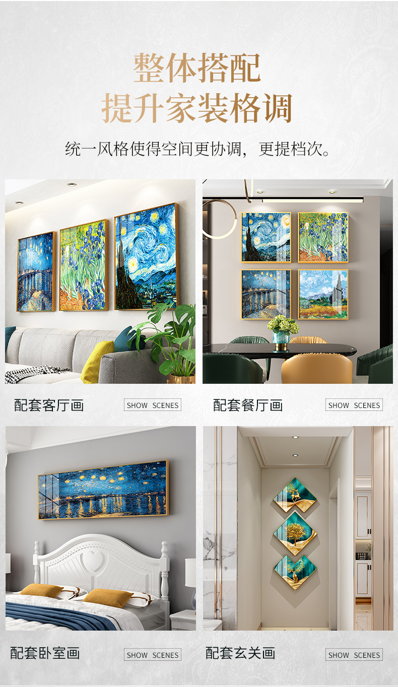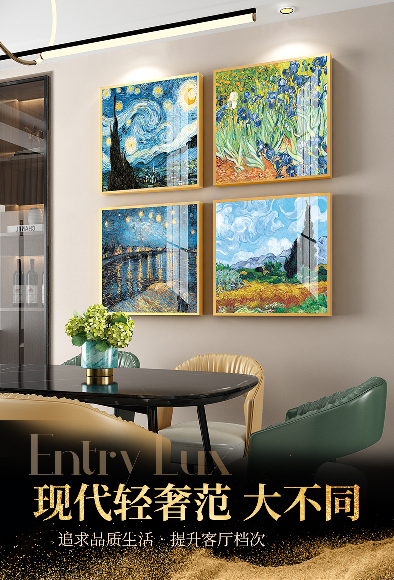 紀恒軟レストランの壁面には、ゴッホの星空の豊穣の名画画を描いた歺庁のレストランの装飾画が描かれています。北欧風の食卓の壁面には、正方形の磁器画が描かれています。高級芸術の壁画は、穴あけなしで壁に描かれています。