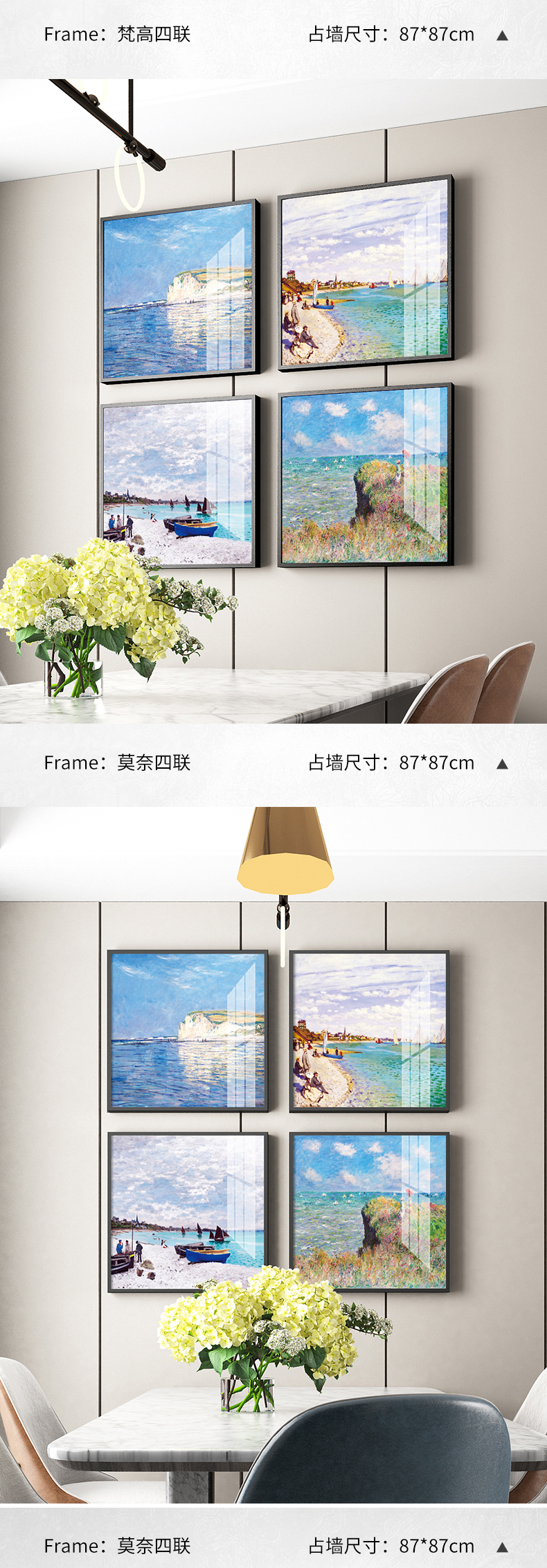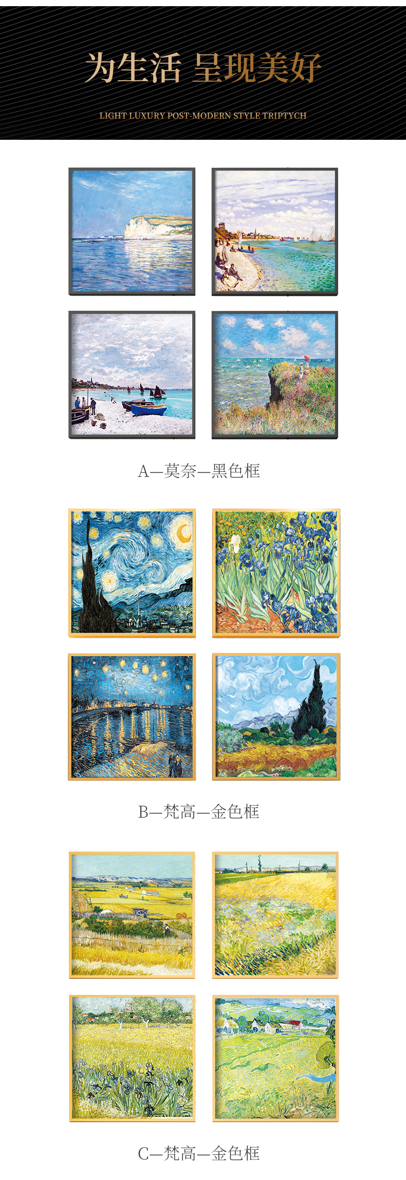 | 商品名称 | 紀恒軟レストランの壁面に、ゴッホの星空の豊作の名画を描いた歺庁のレストラン装飾画北欧風の食卓の壁面の正方形の磁器画高級芸術の壁画を掛けて、穴あけなしの壁画モネ-海辺シリーズ-黒い枠40*40 cm*4(図面全体のサイズ:83*83 cm) |