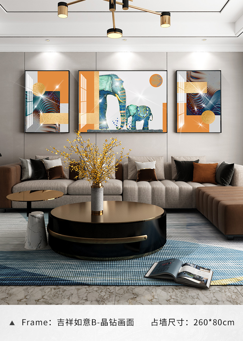 紀恒ふわふわ象装飾画客間のソファーの背景壁壁画現代軽奢晶磁器三連画は簡単な大気抽象画を描いて、家庭用ソフトアクセサリーの無料打孔テレビの壁に掛けた壁画は吉祥如意A-金色枠(晶磁画面)の左右40*60+中60*80(2.5ぐらいのソファーに適しています。)