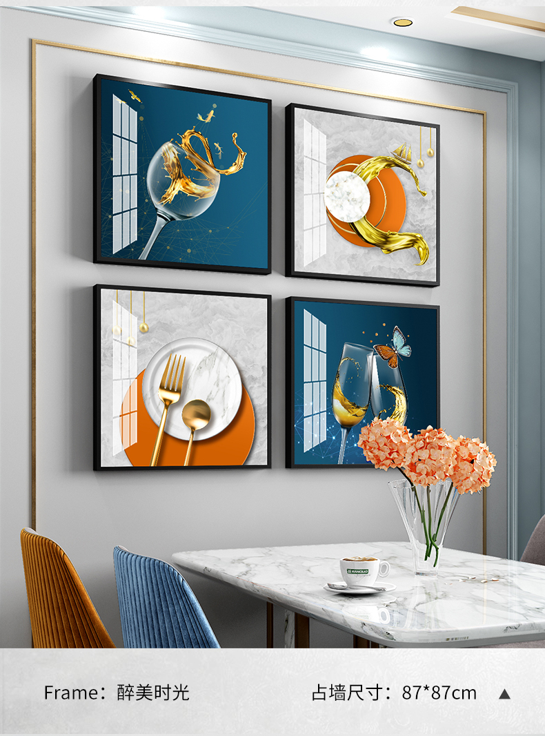 紀恒ふわふわレストラン画は、現代の絵画テーブルの壁面装飾画を簡単に描いています。ロビーの杯の人物晶磁画高級大気小衆の壁画ご飯高級家庭用の穴付き壁画A-酔美時間-黒い枠40*40 cm*4(図面全体のサイズ:83*83 cm)