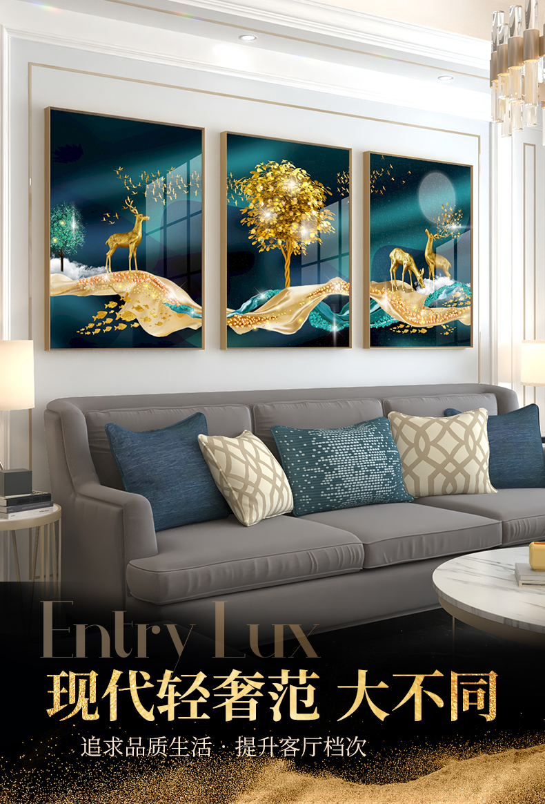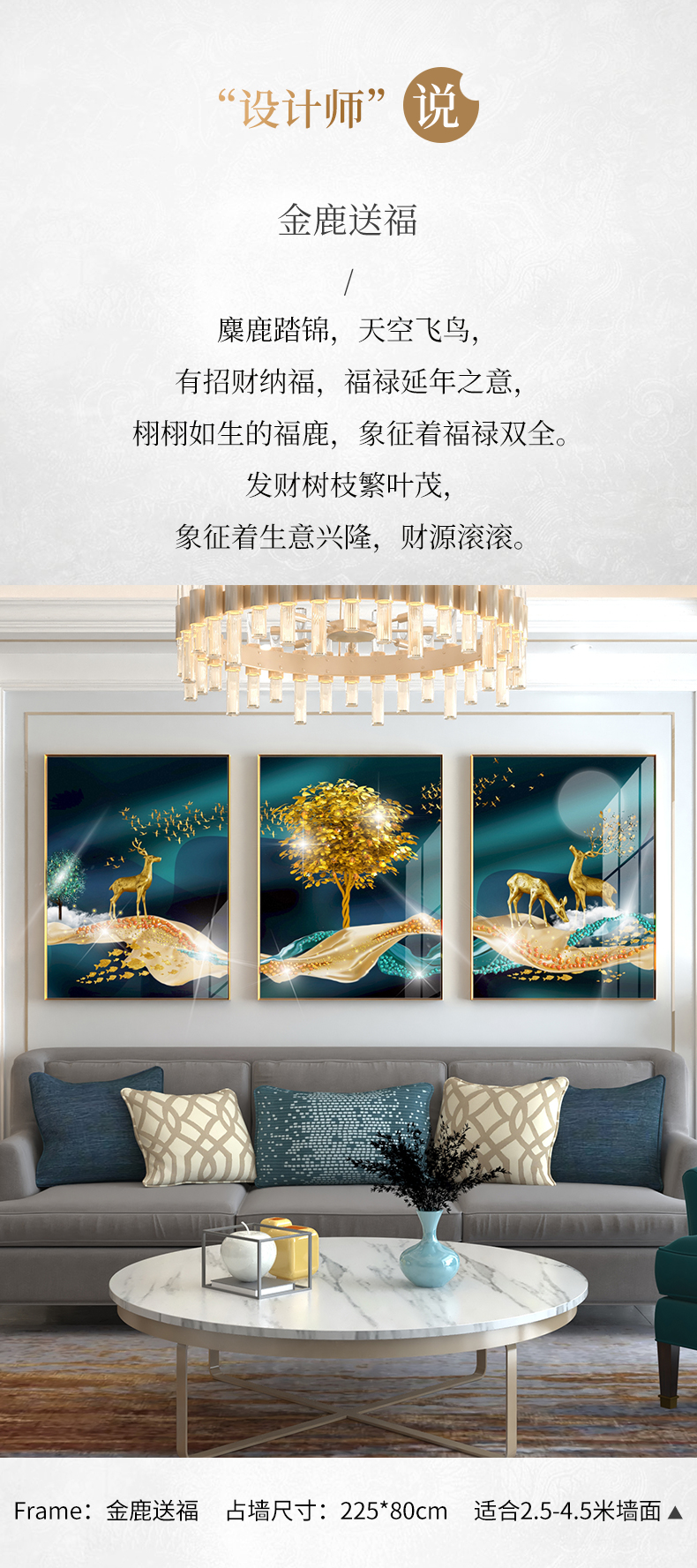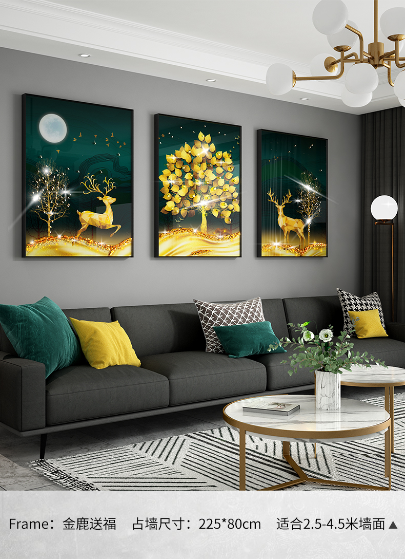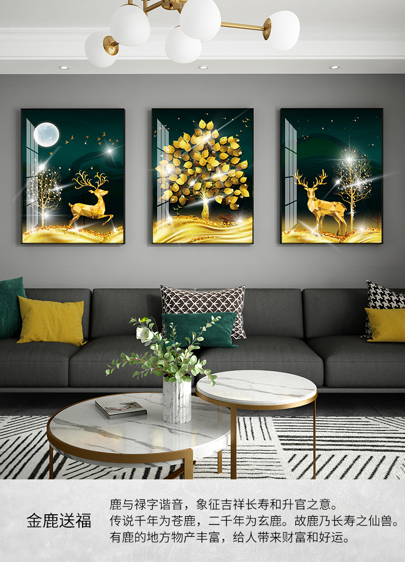 紀恒の柔らかいソファーの背景壁の装飾画は軽奢な客間現代簡単に掛けられています。高級な大気晶磁器の押し入れを描いて、三連住宅の寓意がいいです。鹿が金持ちになりました。壁の絵に穴を開けないで、金鹿を描きます。福J-金色の枠(晶磁)50*70 cm*3枚(2-3メートルぐらいのソファーに適しています。)