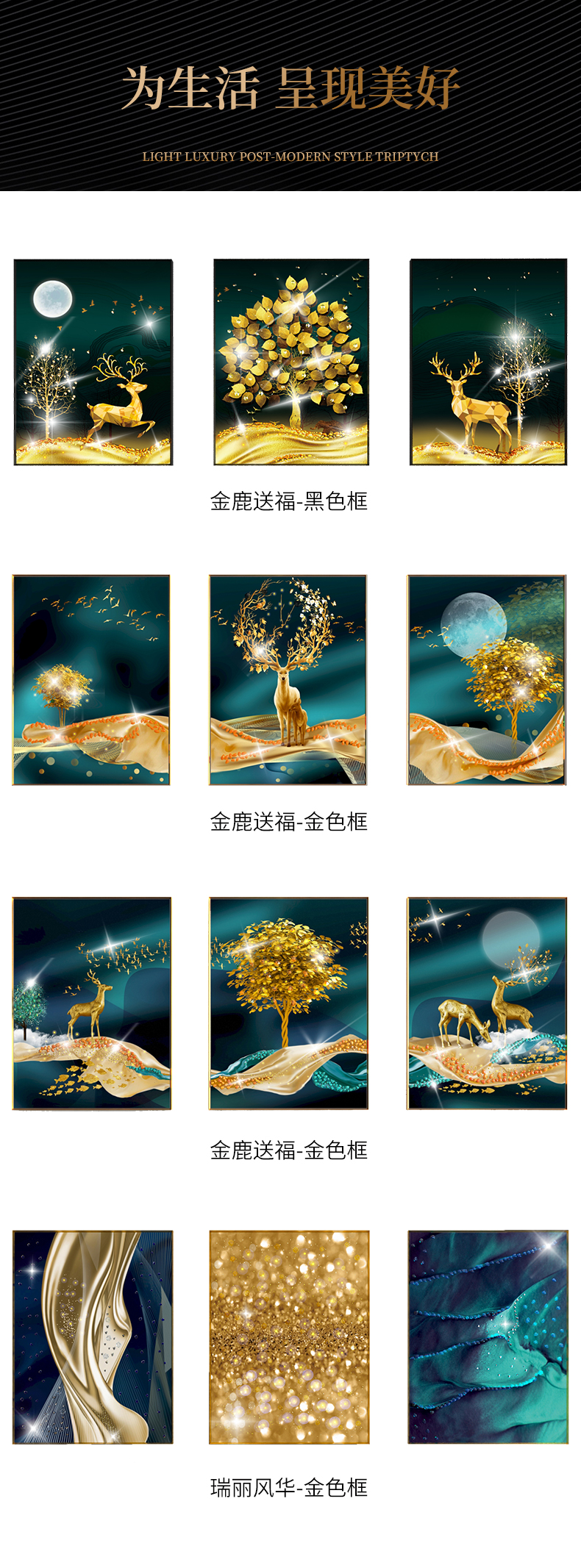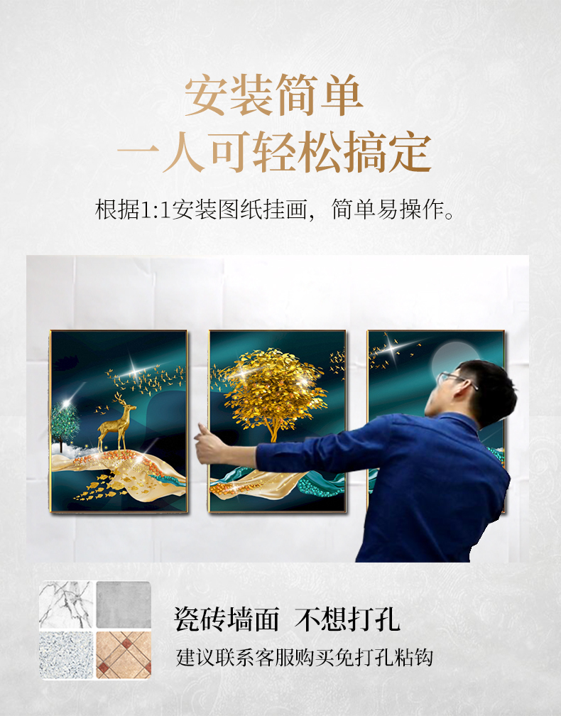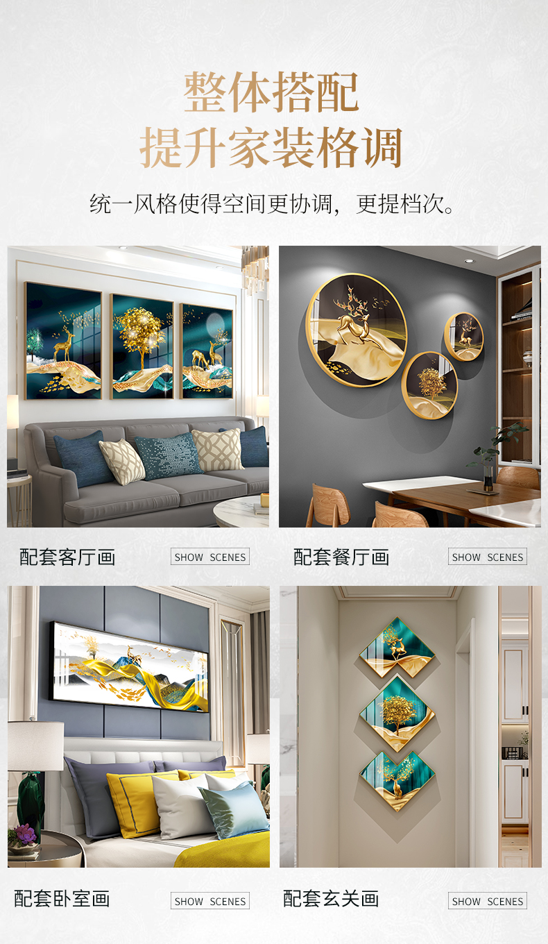 紀恒の柔らかいソファーの背景壁の装飾画は軽奢な客間現代簡単に掛けられています。高級な大気晶磁器の押し入れを描いて、三連住宅の寓意がいいです。鹿が金持ちになりました。壁の絵に穴を開けないで、金鹿を描きます。福J-金色の枠(晶磁)50*70 cm*3枚(2-3メートルぐらいのソファーに適しています。)