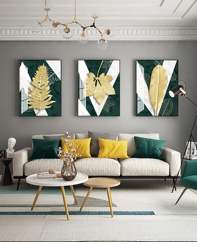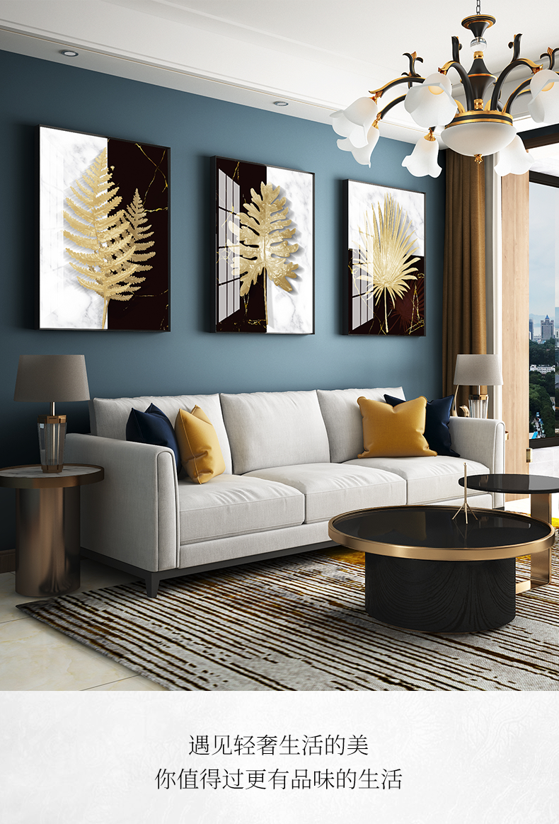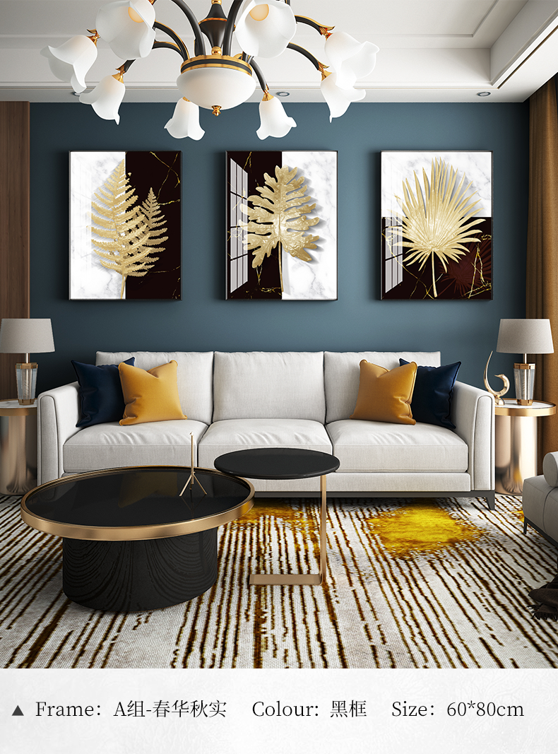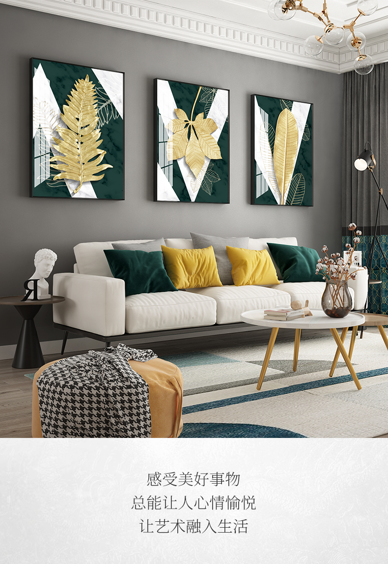 紀恒ふわふわ抽象芸術客間の背景壁装飾画現代簡約ソファーの後ろの掛画晶磁画三連画は穴を開けずに描きます。北欧創意軟装壁画大気壁画C-しかも風吟を聞きます。金色枠60*80 cm(3.5メートルぐらいのソファーに適しています。)