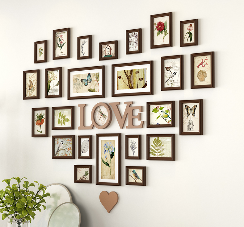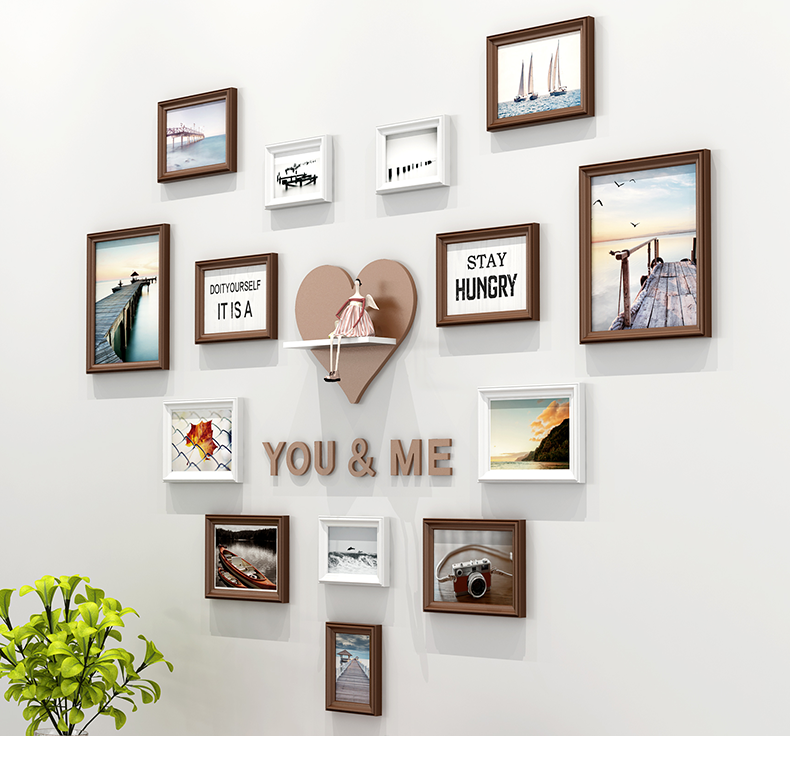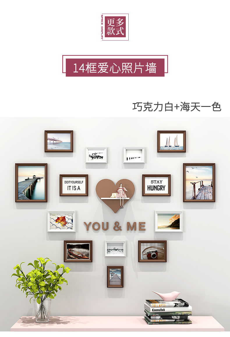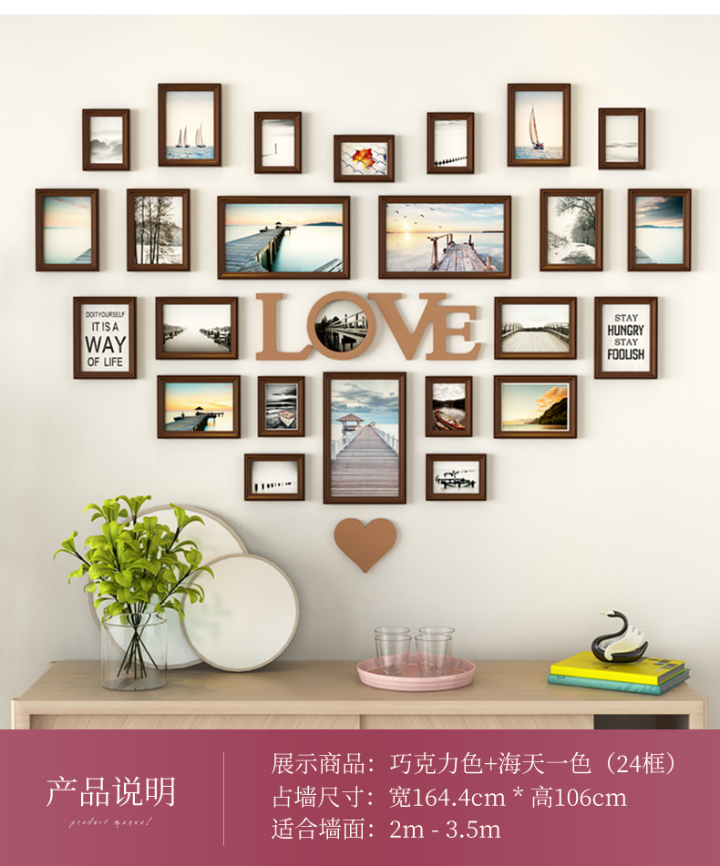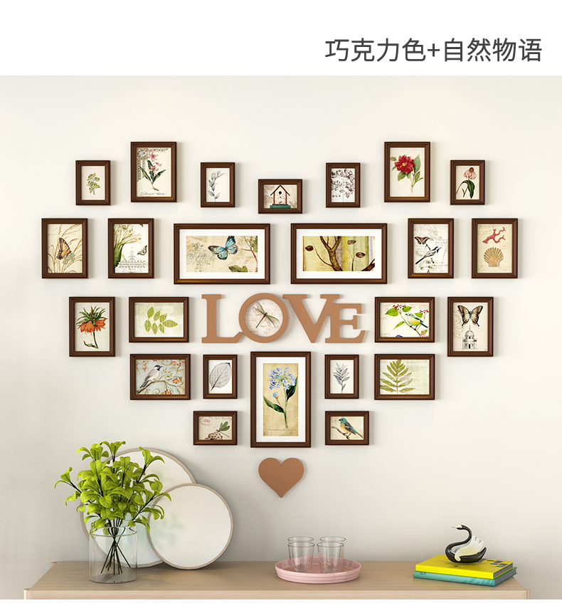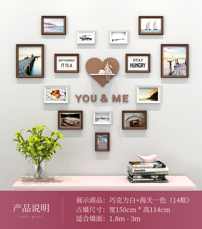 紀恒ふんわりハート形フォトフレーム壁の創意的な組み合わせを簡単に現代客間レストランの木の写真壁の装飾画フレームの全家族の幸せな結婚式の写真は個性的な欧式木製の写真フレームの寝室の写真フレームの壁の14枠のチョコレート色+海天一色です。