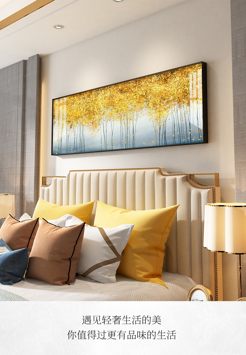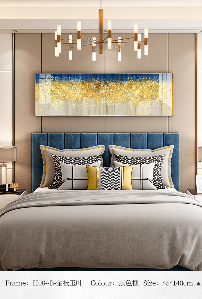 紀恒軟らかい寝室装飾画ベッドの上に、高級で軽奢な磁器画を描いています。近代的で簡単な大気の主な寝室の壁には北欧風のリビングルームの背景壁の壁画が描かれています。壁には金枝玉葉が描かれています。金色のフレーム140*45 cmです。