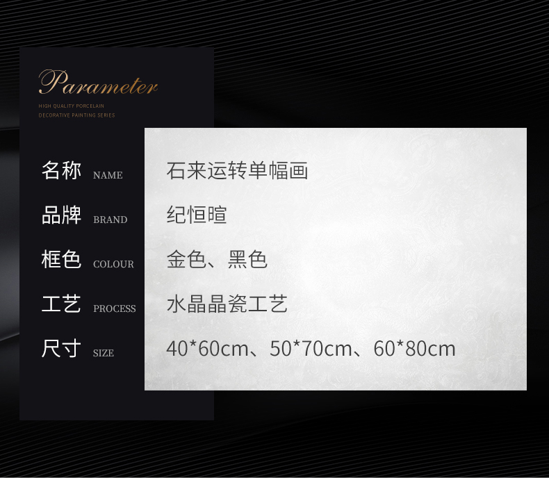 | 商品名称 | 紀恒軟らかい現代簡約歺庁は軽奢な高級レストランの装飾画の一幅の石を掛けて回転します。磁器の絵は穴が開けられないで、廊下に現代中国式の食卓の上の横の壁画C-運旺石盛-金色の枠の60*80 cmをかきます。 |