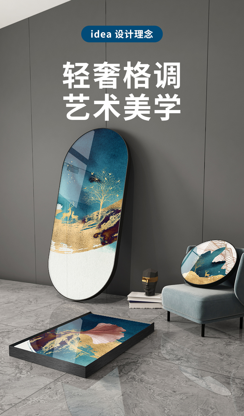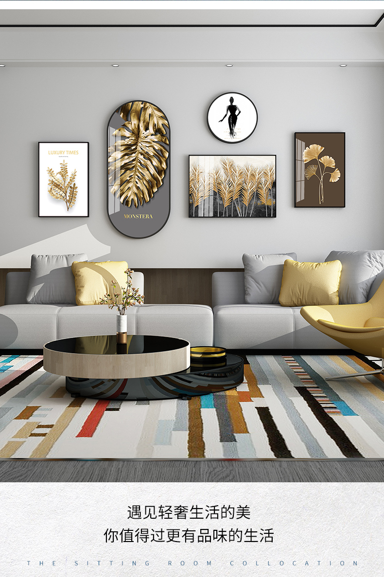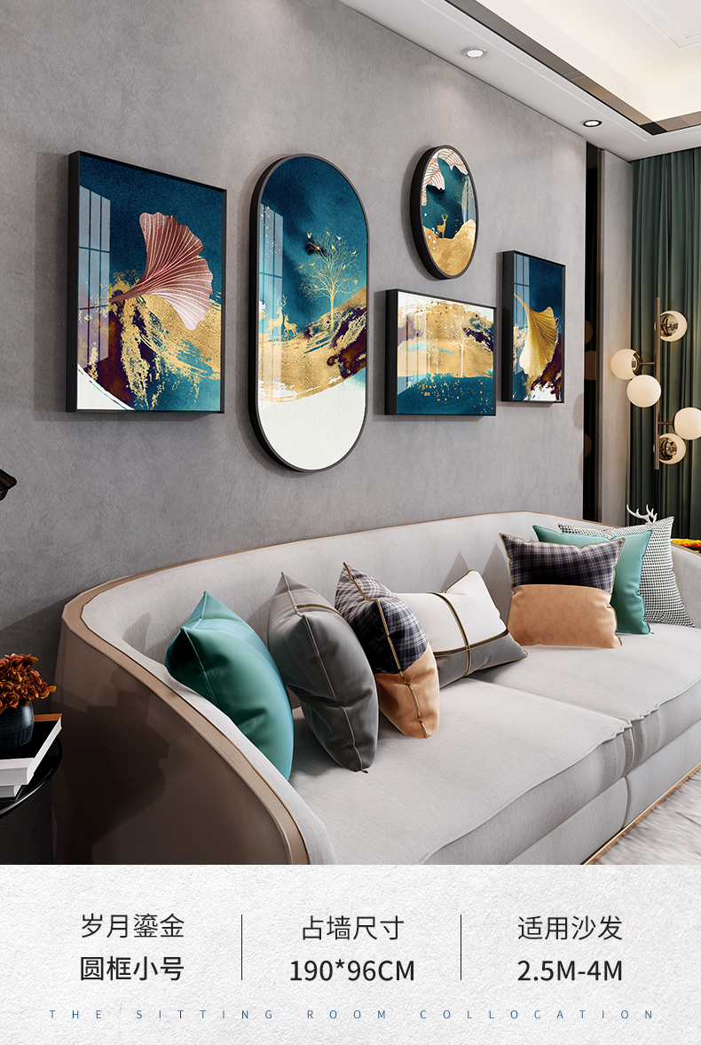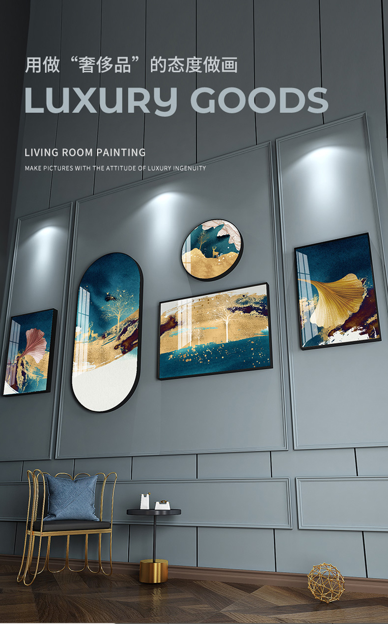 紀恒の柔らかいソファーの背景壁の装飾画は軽奢で高級な雰囲気のリビングルームの豪華な掛け絵で北欧の抽象的な磁器画の不規則な壁の壁に、新しい中国式の金色の葉の壁に歳月の純度の高い金を描いています。