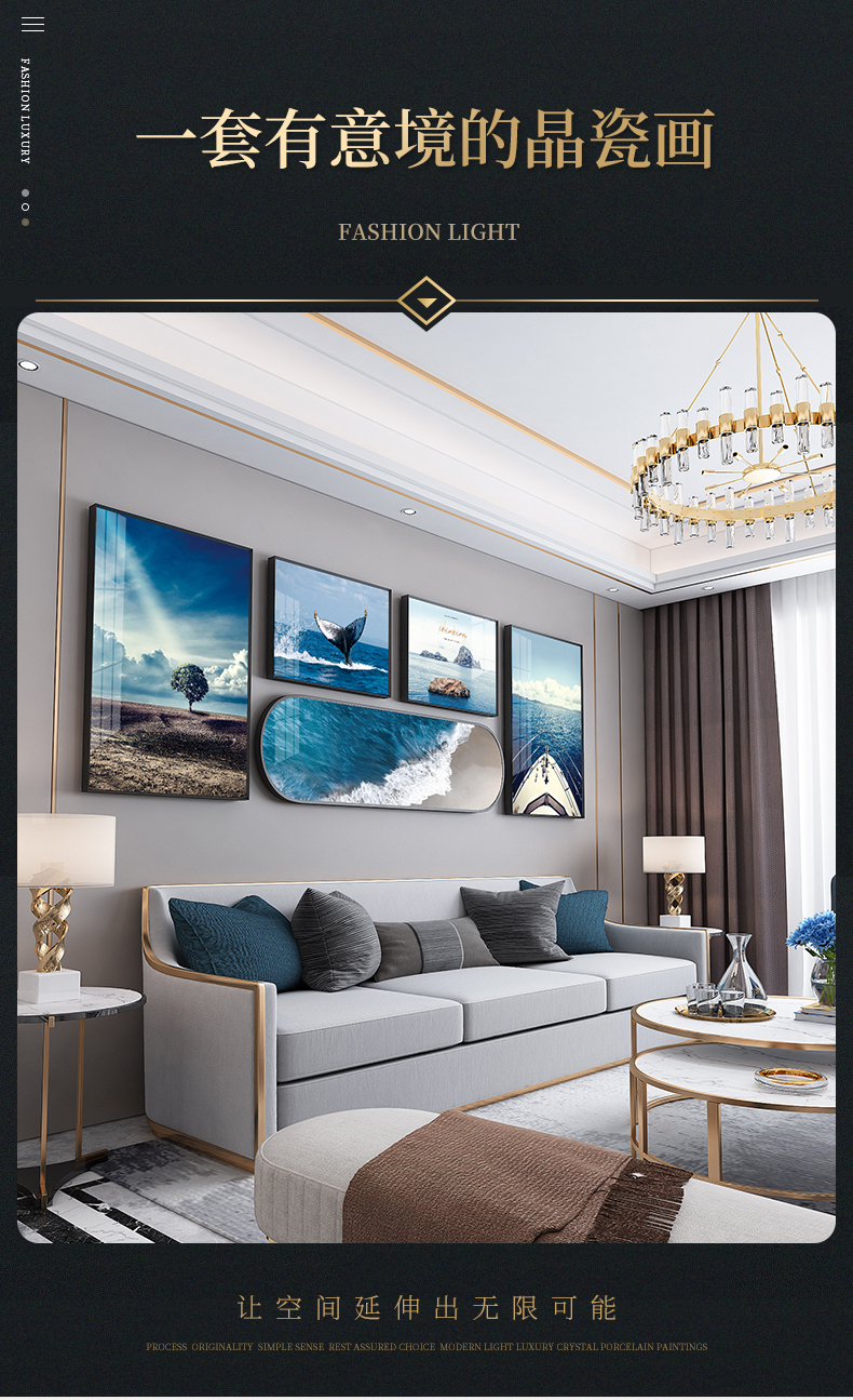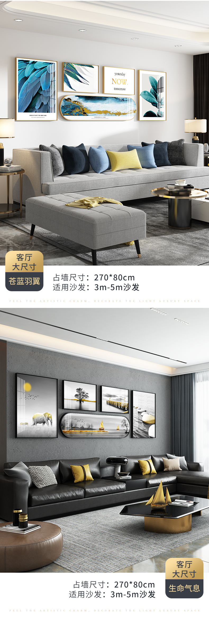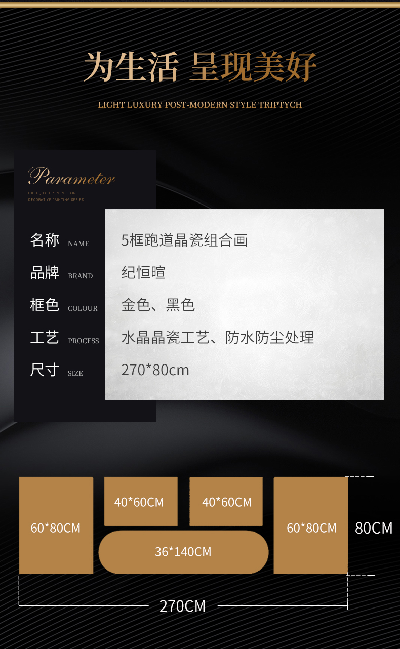商品名称紀恒軟らか客間の背景壁の装飾画の超大型高級セット掛画ホームホールの軽豪華な大気創意円角壁画別荘金色葉莫蘭迪浪漫壁画芸術生活全体の幅は2.7メートルで、高0.8メートル(アルミニウム合金フレームの晶磁画)