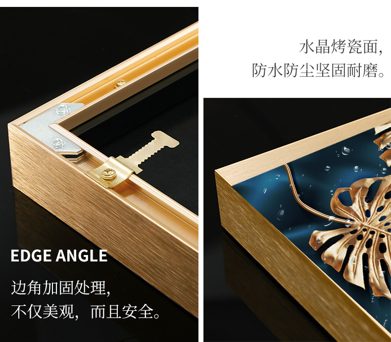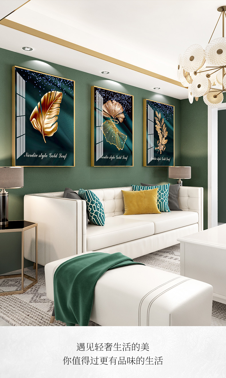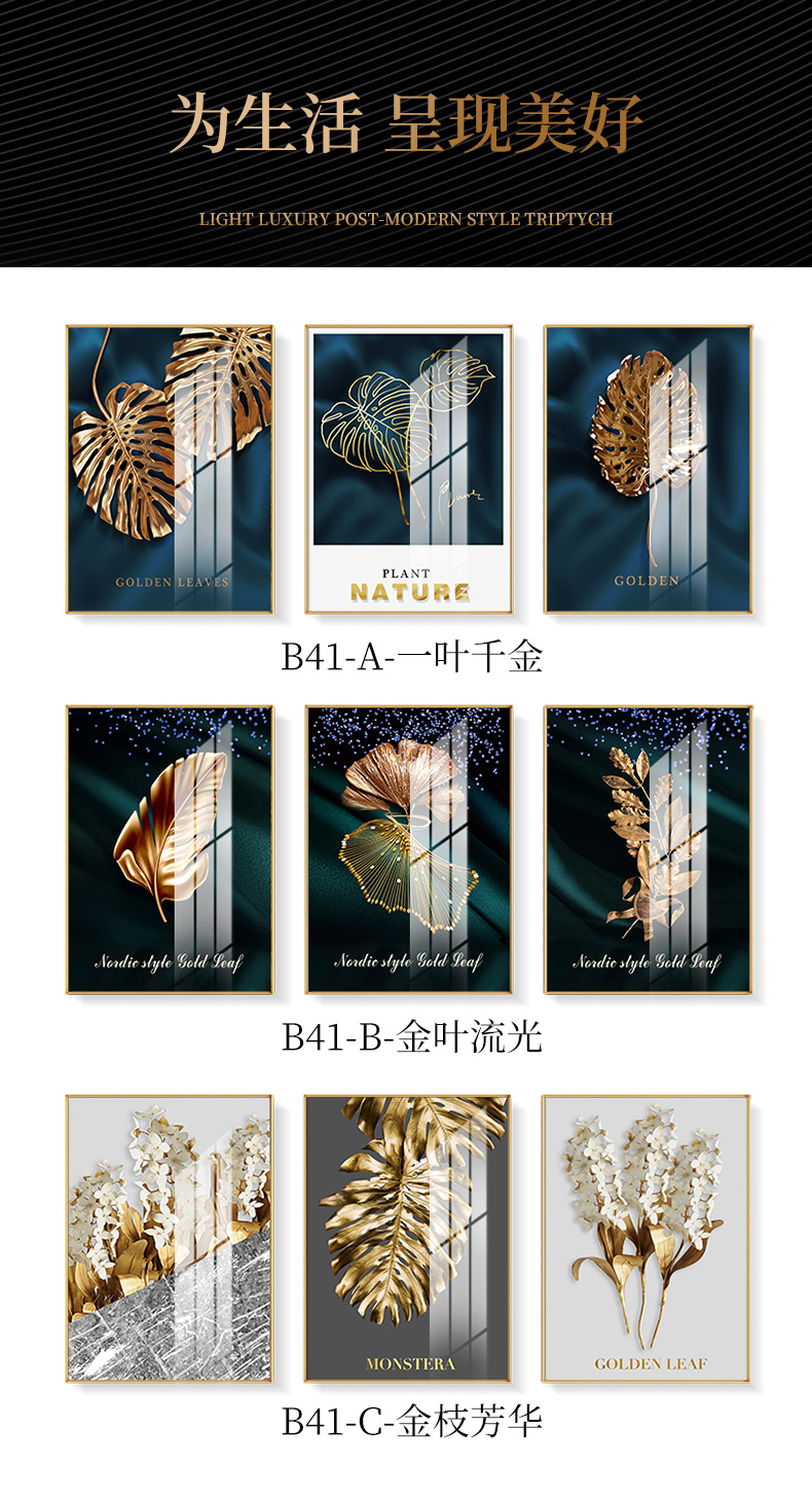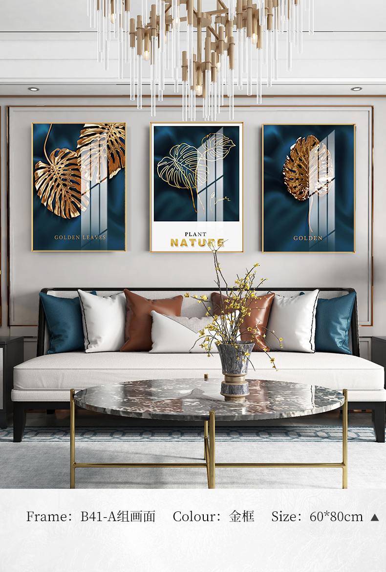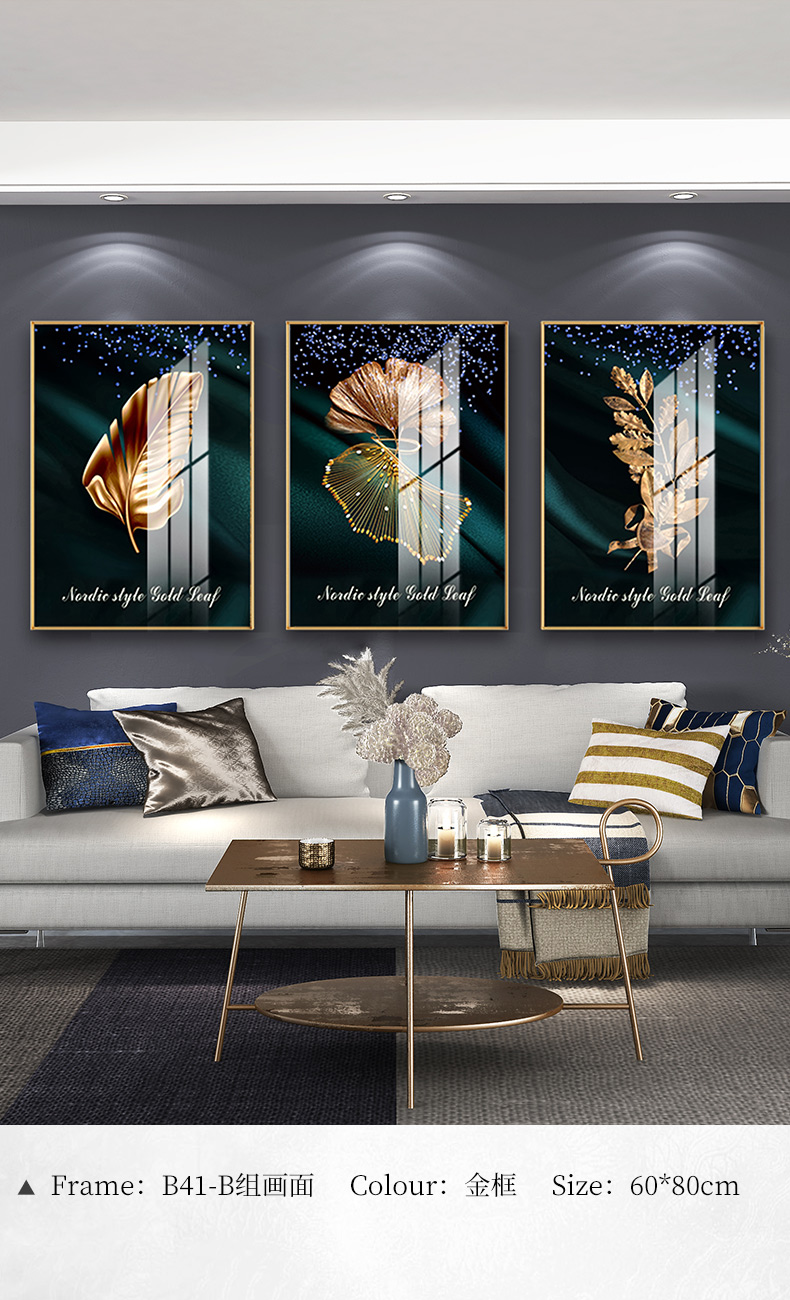 紀恒軟らかい現代軽贅沢掛画客間ソファの背景壁装飾画三連画縦版北欧簡約風テレビ壁画室内晶磁画免除打孔壁画家装壁画B-金葉流光-金色枠50*70 cm(2.5メートルぐらいのソファーに適している)