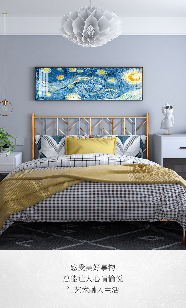 紀恒ふわふわベッドルームの枕元に世界の名画を描いたゴッホモネの一幅の横柄の掛け軸を描いた、主な寝台創意芸術の水晶磁器の軽豪華な北欧現代客間ソファの背景壁にゴッホの絵を描きました。