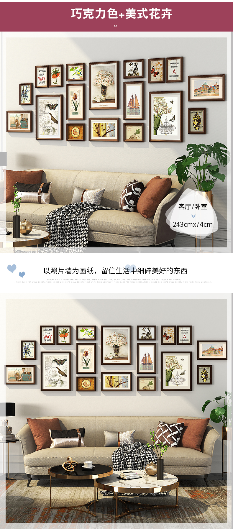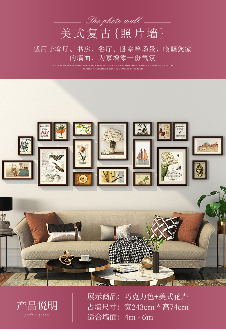 紀恒ふわふわアメリカの実木写真壁のフレーム掛壁の組み合わせは簡単で現代的なアイデアです。ヨーロッパの寝室のリビングルームの装飾画フレームの背景壁の大きい写真フレームの横の写真壁の創意的なレトロな表装フレームのチョコレート色+アメリカンフラワー
