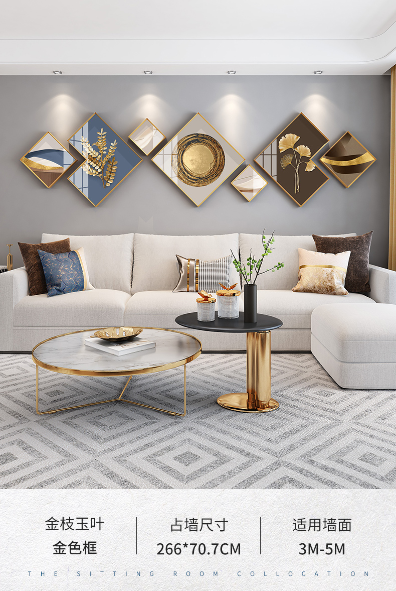 紀恒ふわふわ現代抽象装飾画客間のソファーの背景壁の創意的な線の掛け絵によって財を招きます。鹿の重ね合わせセットの壁画を組み合わせた室内の軽奢で高級な大気水晶画の壁画C-錦瑟和鳴-金色アルミニウム合金の外枠210*50 cm(2.5-4.5メートルぐらいのソファーに適しています。)