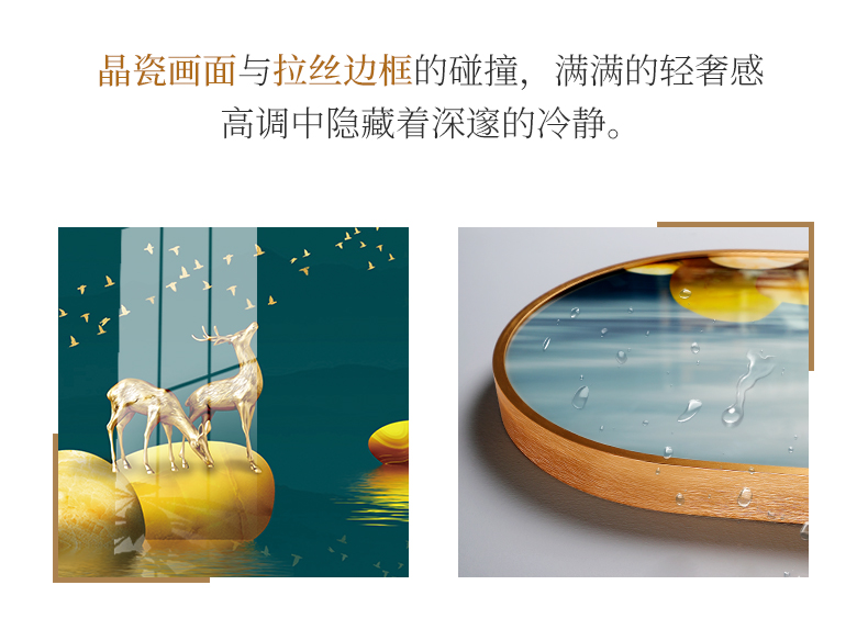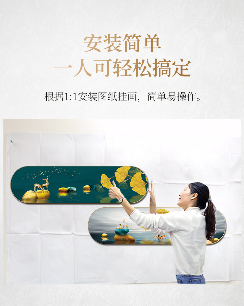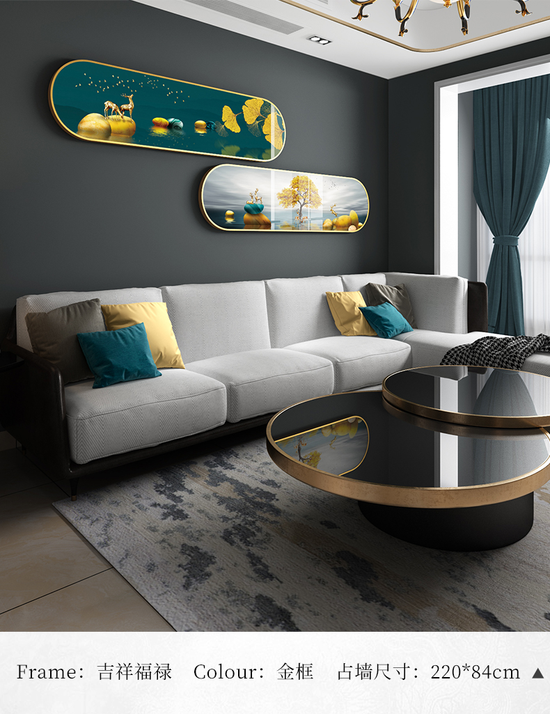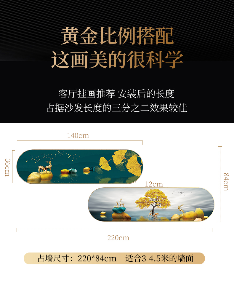 紀恒ふんわりとした高品位なリビング装飾画ソファの後ろの背景壁の壁画の水晶磁器の掛け絵横断幕中国風長条現代の鹿の風景の葉大気簡約壁掛図P 01-B-吉祥福禄-金色枠の2つの組み合わせ(全体サイズ:220*84 cm)