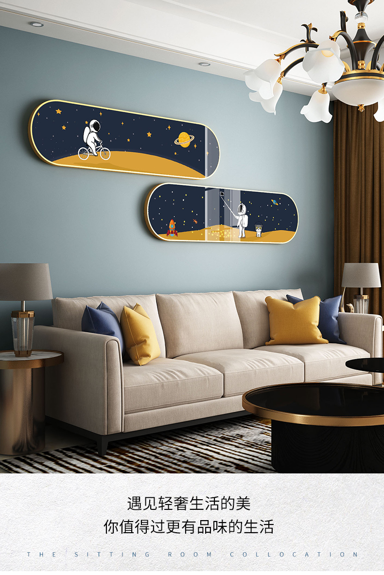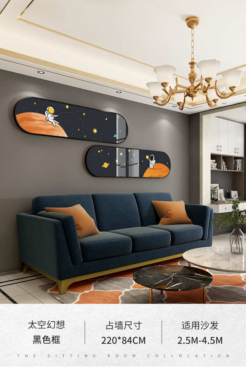 紀恒ふわふわ北欧装飾画リビングルームのソファーの背景壁と空間の絵画創意的な漫画の子供部屋のベッドルームの壁画現代の光豪華な宇宙飛行士の暖かいロマンチックな横断幕の長い壁画A-宇宙幻想-黒い枠の2つの組み合わせ(全体のサイズ:220*84 cm)