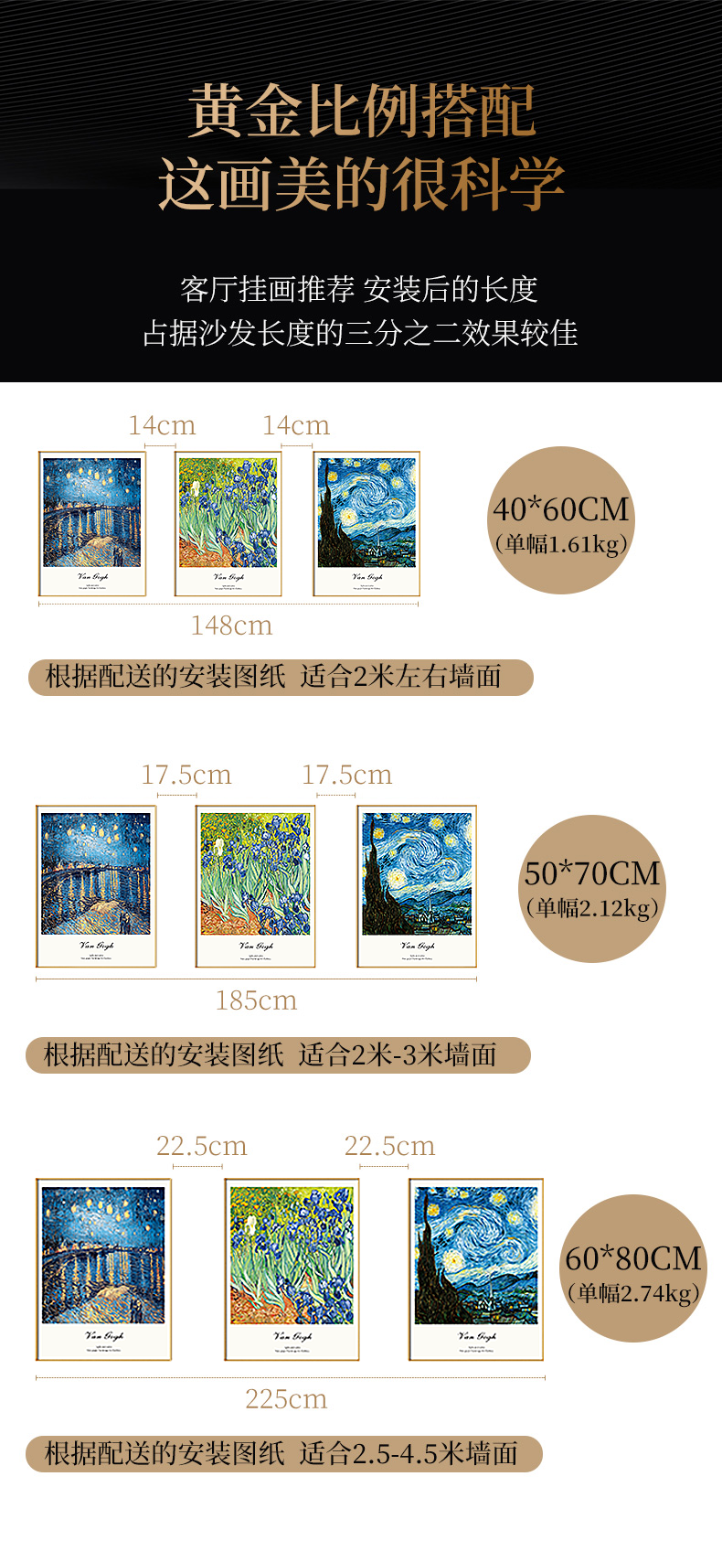 商品名称紀恒軟世界名画ゴッホ客間装飾画ソファの後ろの壁の背景壁壁壁壁掛画壁壁壁壁掛画壁掛画壁組壁画創意芸術免除穴壁画星空-B(組み合わせ)-金色枠60*80 cm(3.5メートルぐらいのソファーに適しています)