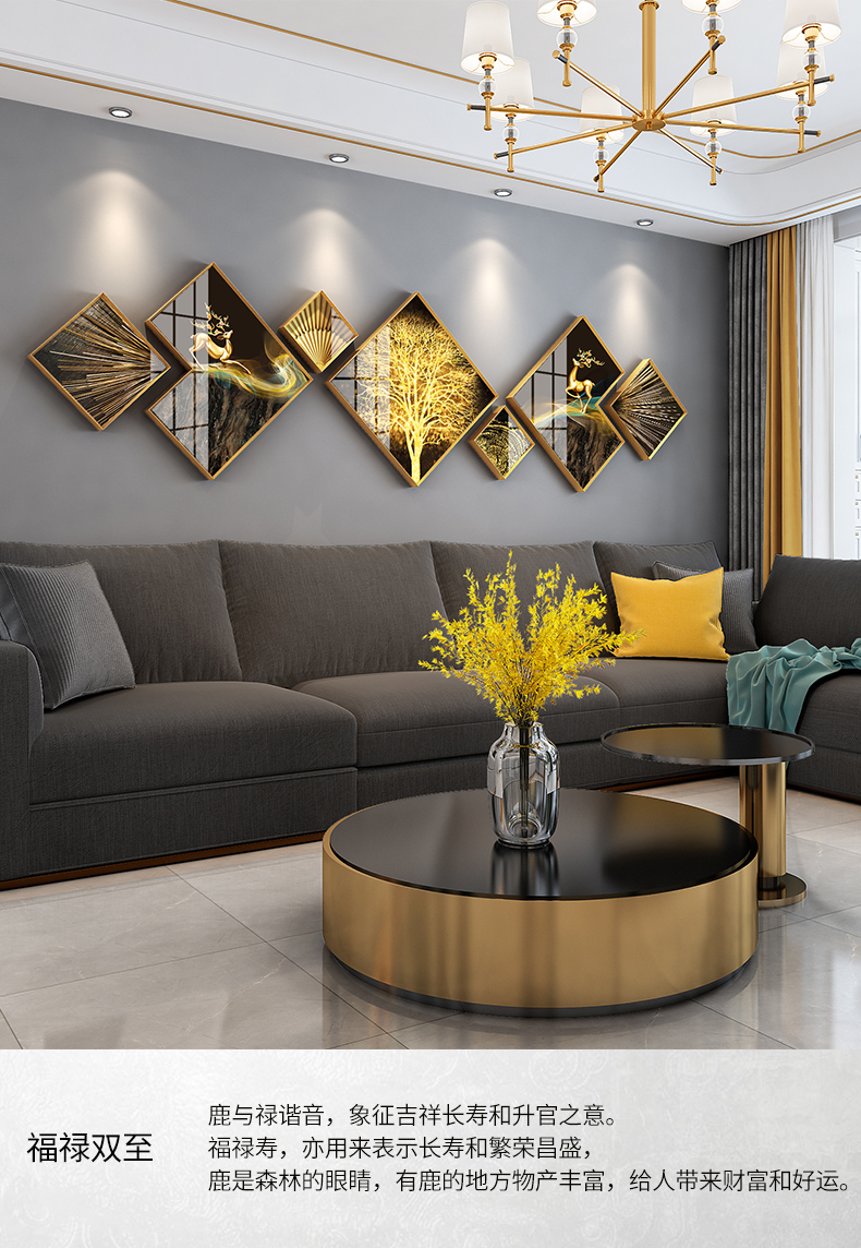 紀恒ふわふわ現代軽豪華客間壁飾りテレビの背景壁装飾家屋壁壁壁壁掛シンプルソファー壁壁の装飾装飾品の覆い縁側縁側招财鹿壁装飾福禄双至-金色枠(サイズ:266*70.7 cm)ラ糸工芸アルミ合金フレーム