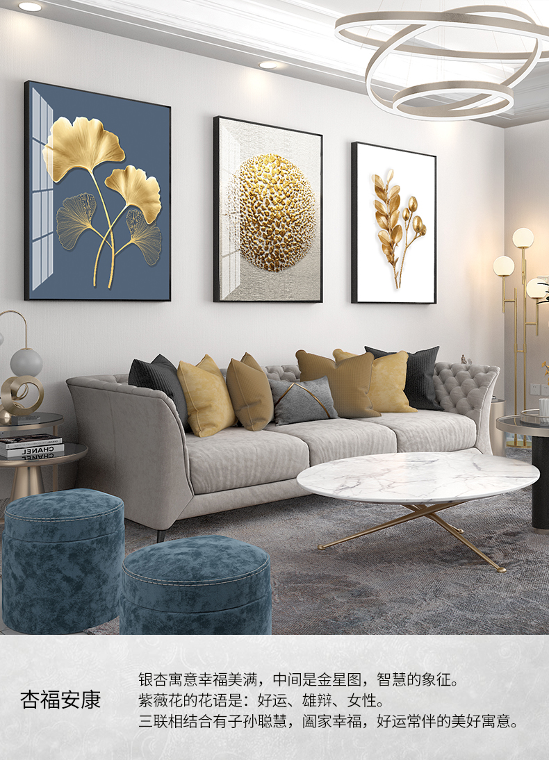 紀恒ふわふわの抽象的な鹿の背景壁にリビングソファを飾った後、壁に掛けた絵は現代の軽い豪華な大気創意新型三連画家族別荘の柔らかい壁画の壁画A-幾何学的な鹿-金色のアルミニウム合金フレーム40*60 cm(2メートルぐらいのソファーに適している)