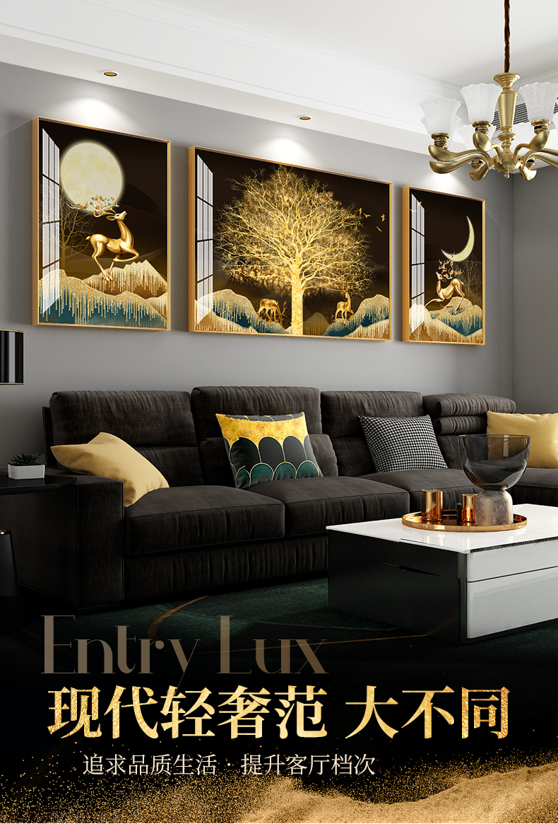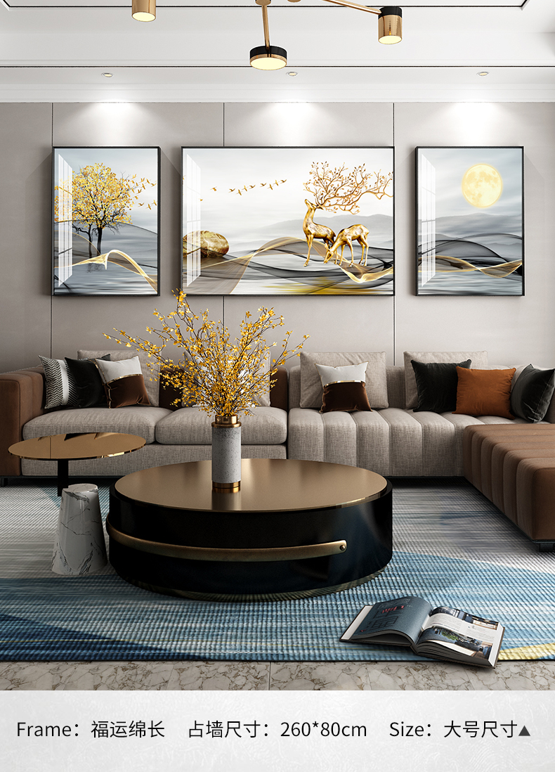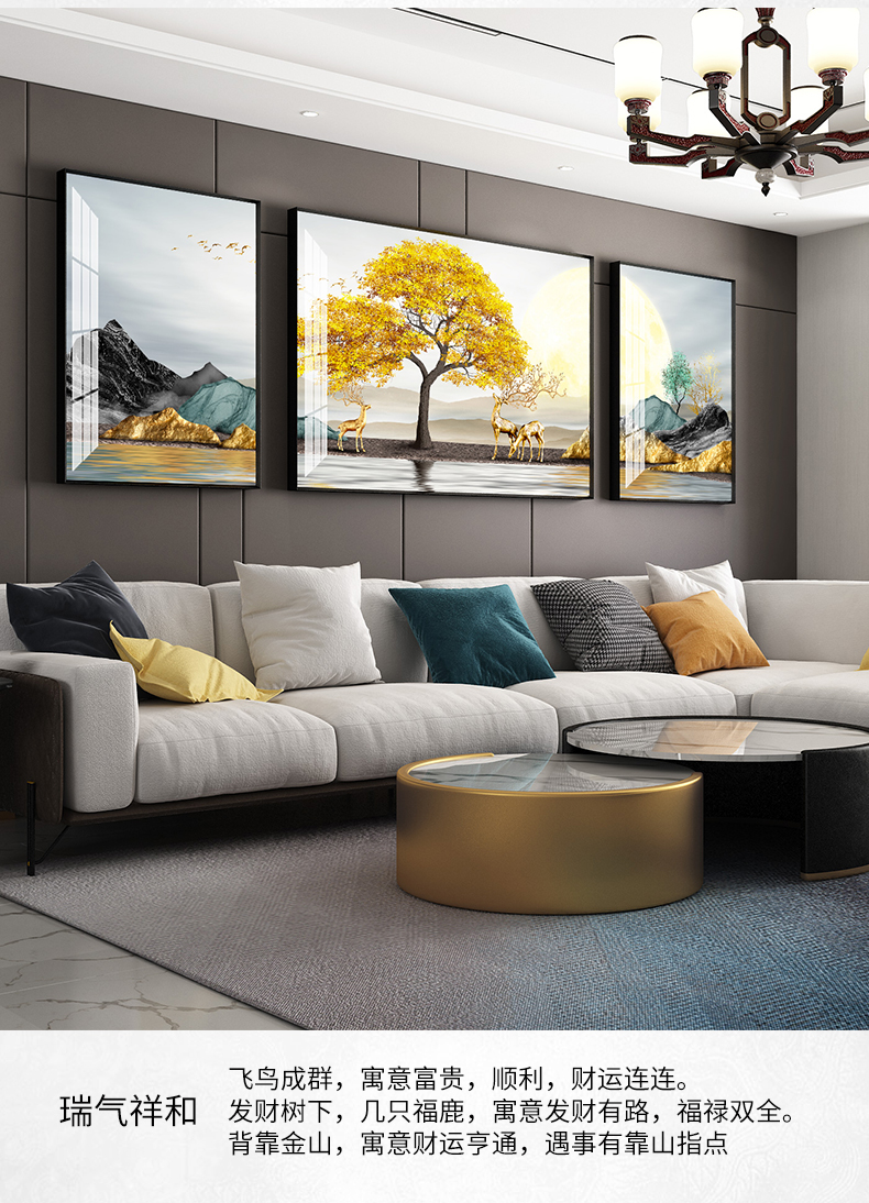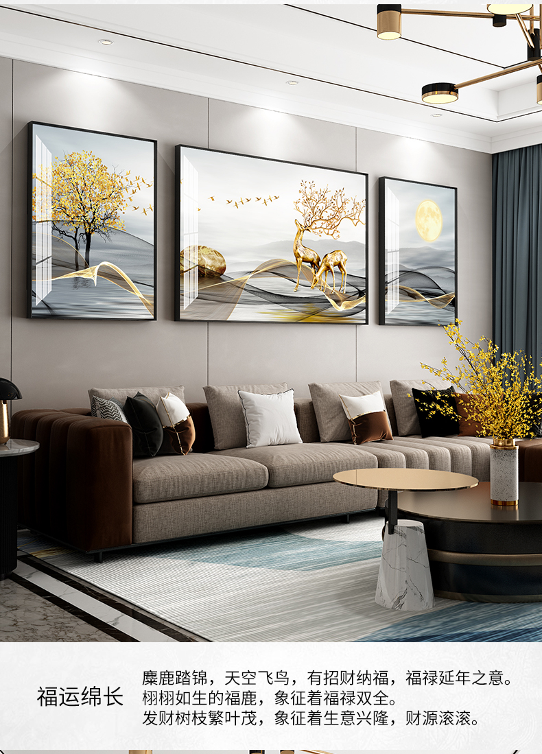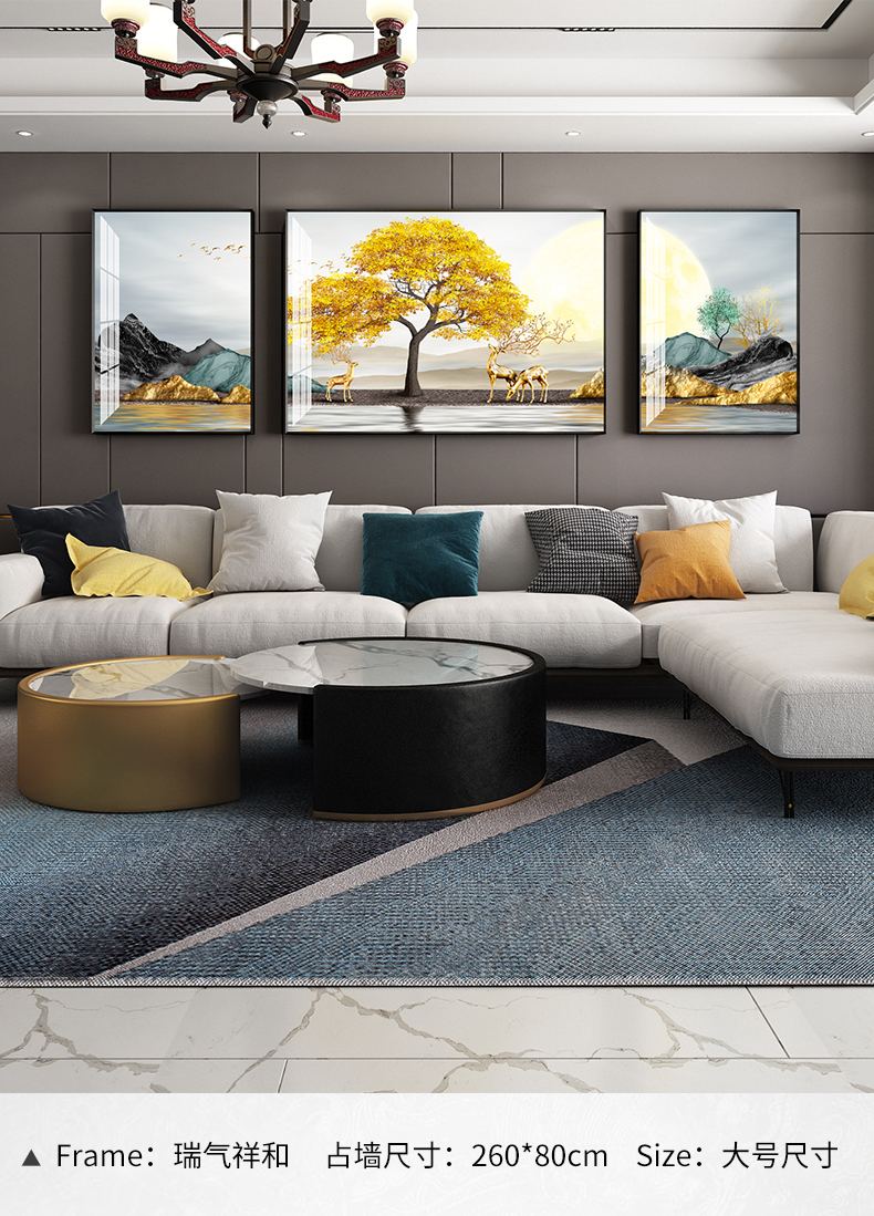 | 商品名称 | 纪恒暄 大气装饰画客厅沙发后面墙上的挂画轻奢高档寓意好的三联画麋鹿新中式创意背景墙壁画别墅大幅墙画 瑞气祥和-黑色框 左右50*70+中70*100(3.5米左右沙发) |