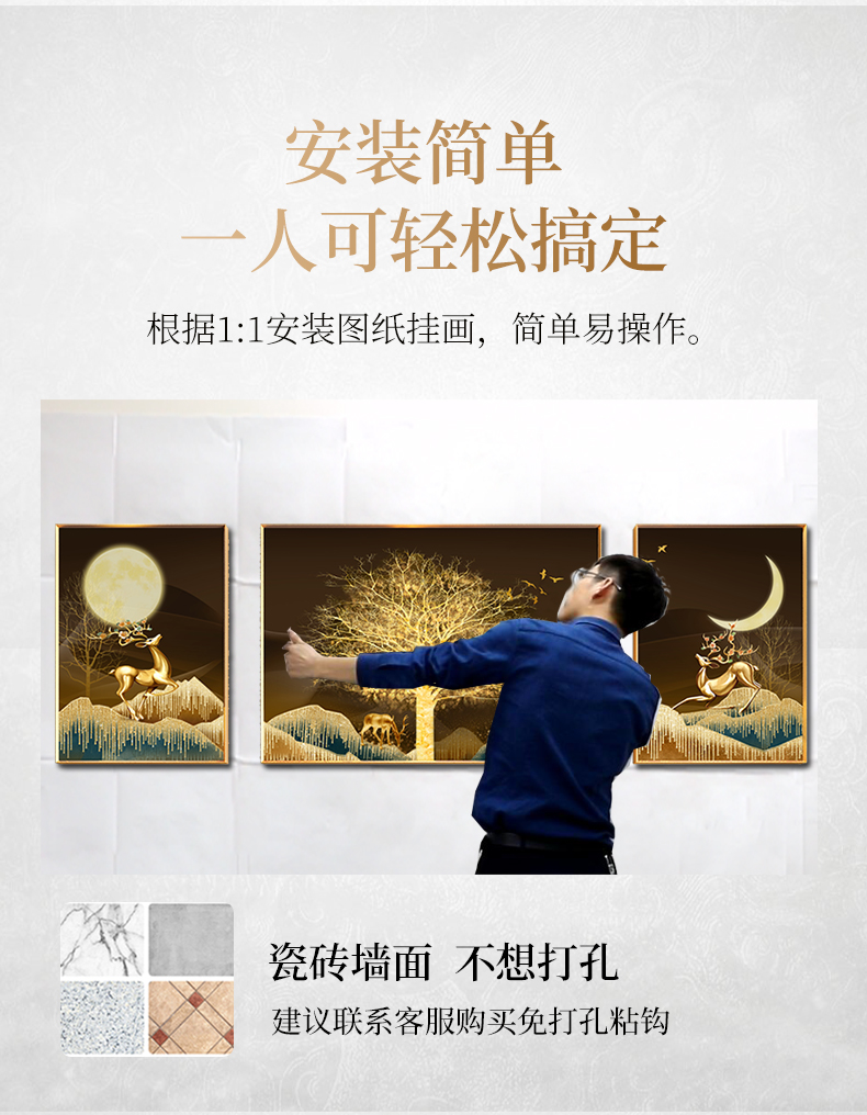 紀恒ふんわりとした大気装飾画リビングソファの後ろの壁に掛けられた絵は、軽くて豪華で高級な寓意の良い三連画である。鹿の新しい中国式創意的な背景壁の壁画別荘は大きな壁に瑞祥が描かれている。黒い枠は50*70+中70*100(3.5メートルぐらいのソファー)
