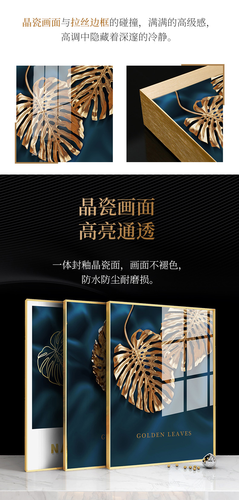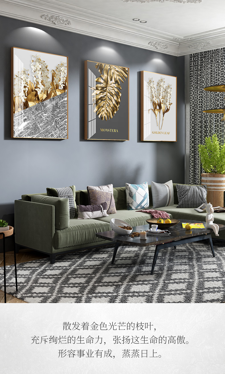 紀恒軟らかい現代軽贅沢掛画客間ソファの背景壁装飾画三連画縦版北欧簡約風テレビ壁画室内晶磁画免除打孔壁画家装壁画B-金葉流光-金色枠50*70 cm(2.5メートルぐらいのソファーに適している)