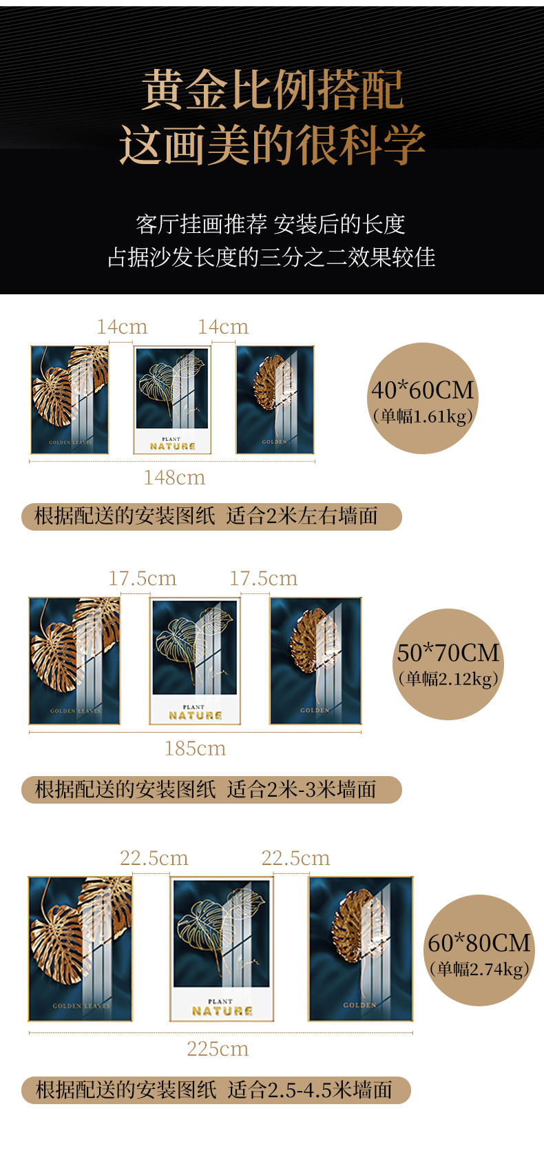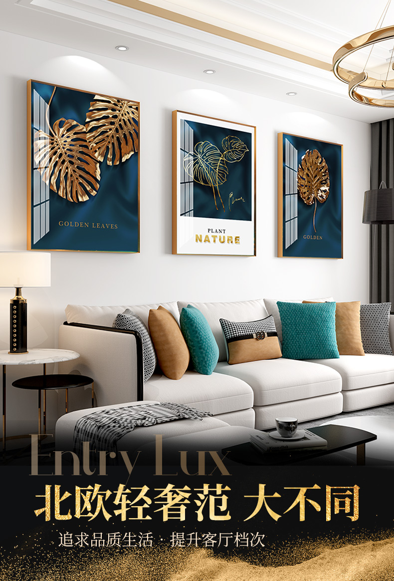 トップ 北欧現代 紀恒軟らかい現代軽贅沢掛画客間ソファの背景壁装飾画三連画縦版北欧簡約風テレビ壁画室内晶磁画免除打孔壁画家装壁画B-金葉流光-金色枠50*70 cm(2.5メートルぐらいのソファーに適している)
