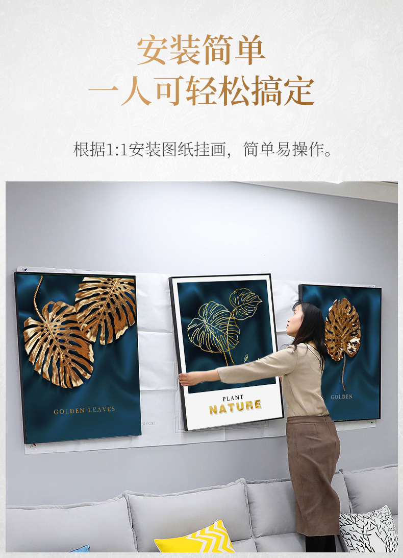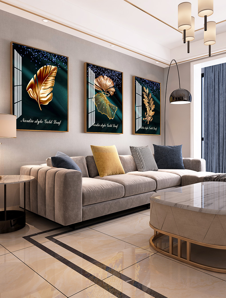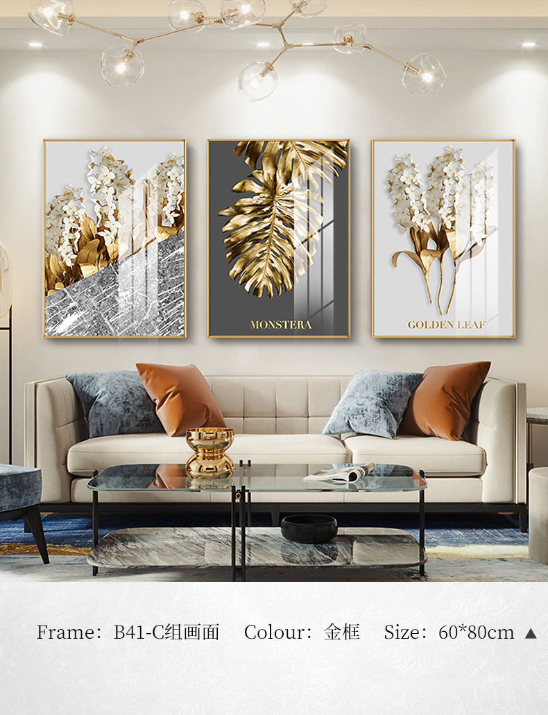 紀恒ふわふわ現代光豪華掛画客間ソファ背景壁装飾画三連画縦版北欧簡約風テレビ壁画室内晶磁画免除打孔壁画家装壁画B-金葉流光-金色枠50*70 cm(2.5メートルぐらいのソファーに適している)【写真価格ブランド見積】