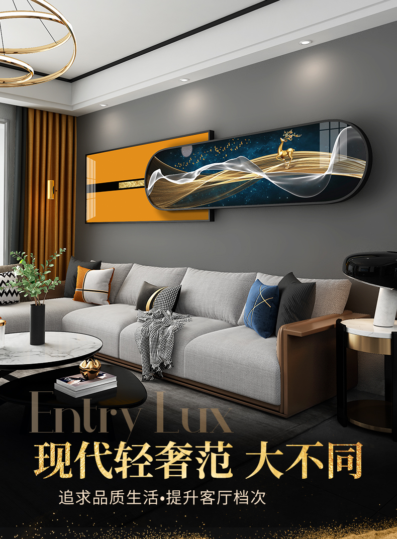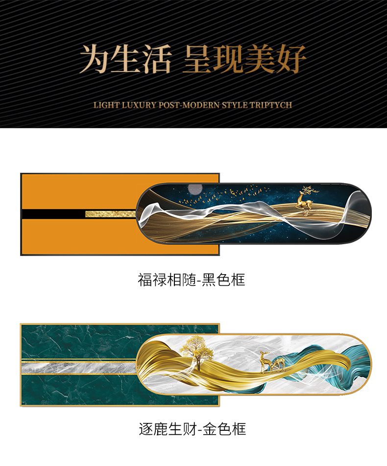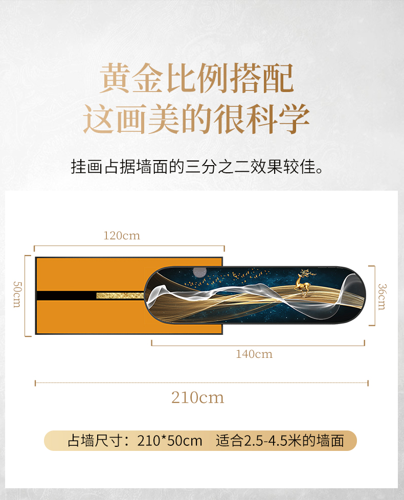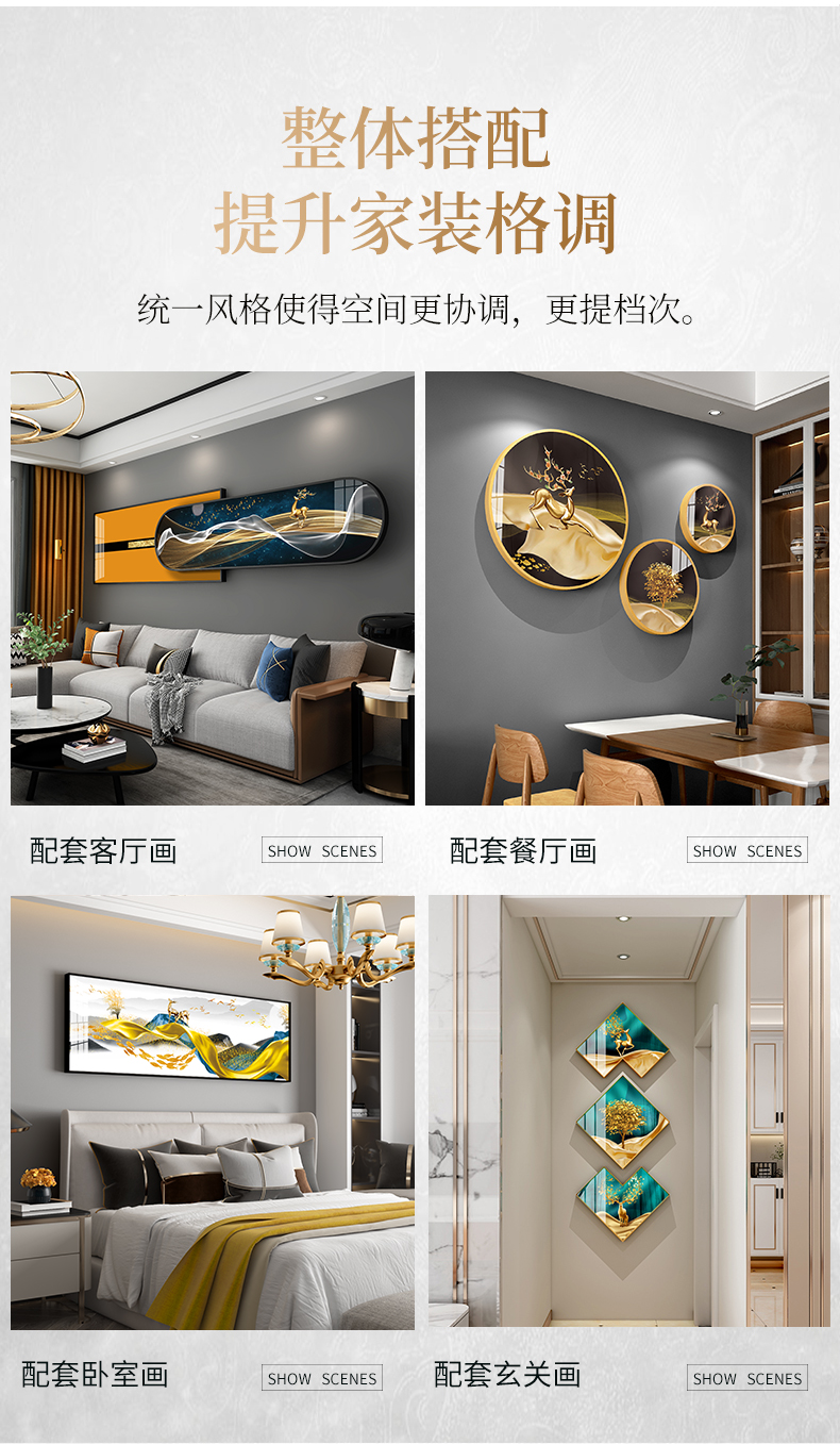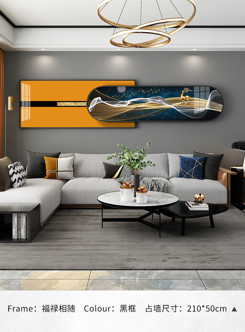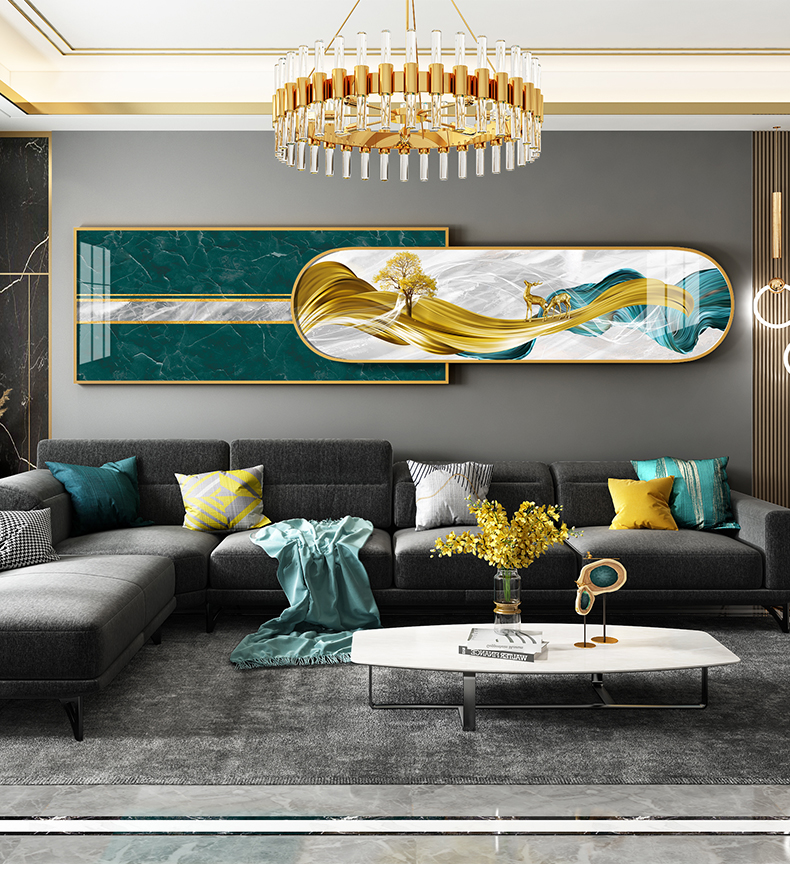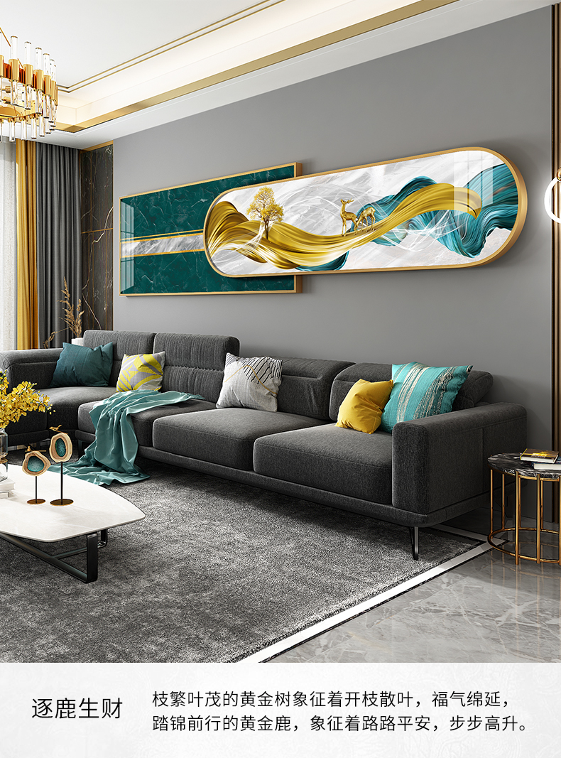 紀恒ふんわりとした新しい中国式のリビングソファの後に壁の装飾画の家が壁に適した装飾画を描いています。背景壁に適した高級な軽贅沢な組み合わせの壁画が簡単で現代のファッション的な個性的な家装の壁画が鹿の財産を生みます。金色のフレームのサイズは210*50 cmで、2.5-4.5メートルぐらいのソファーに適しています。