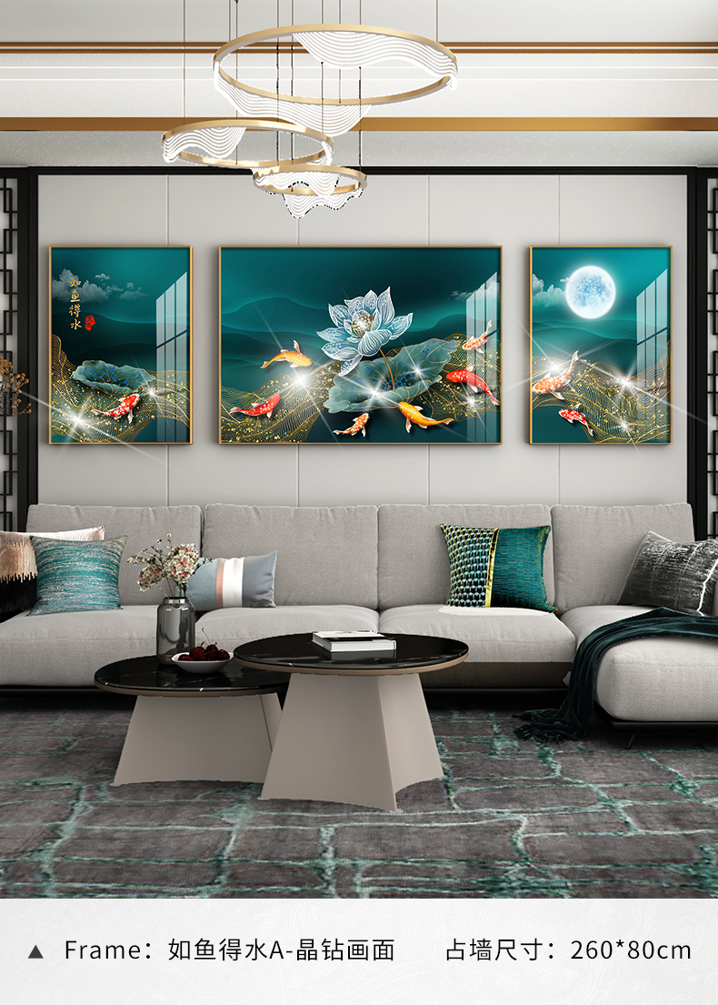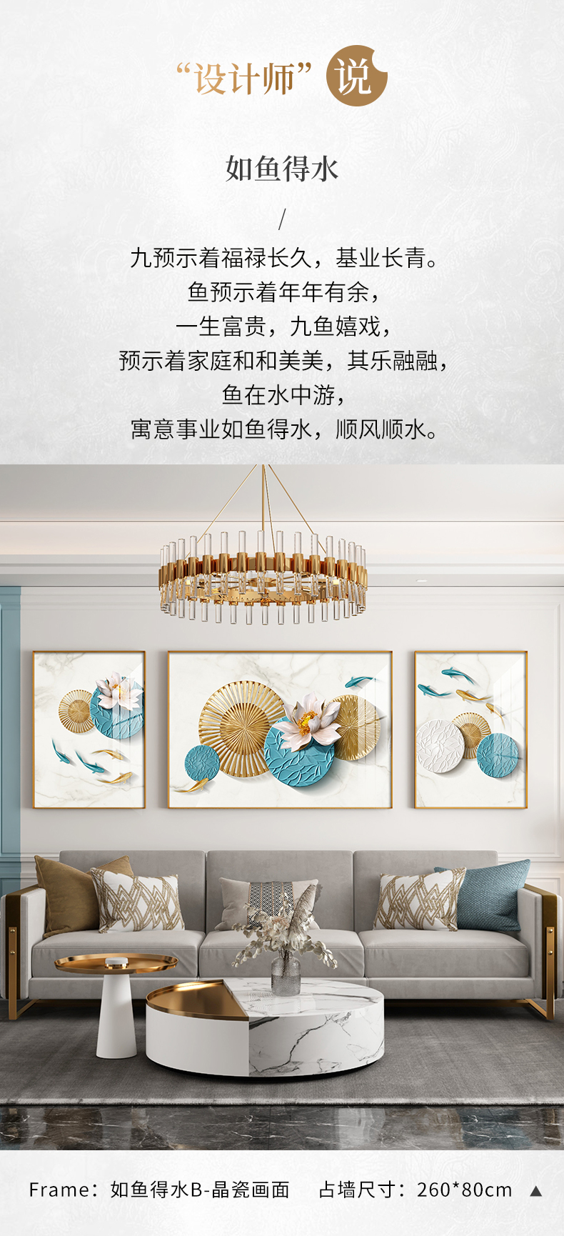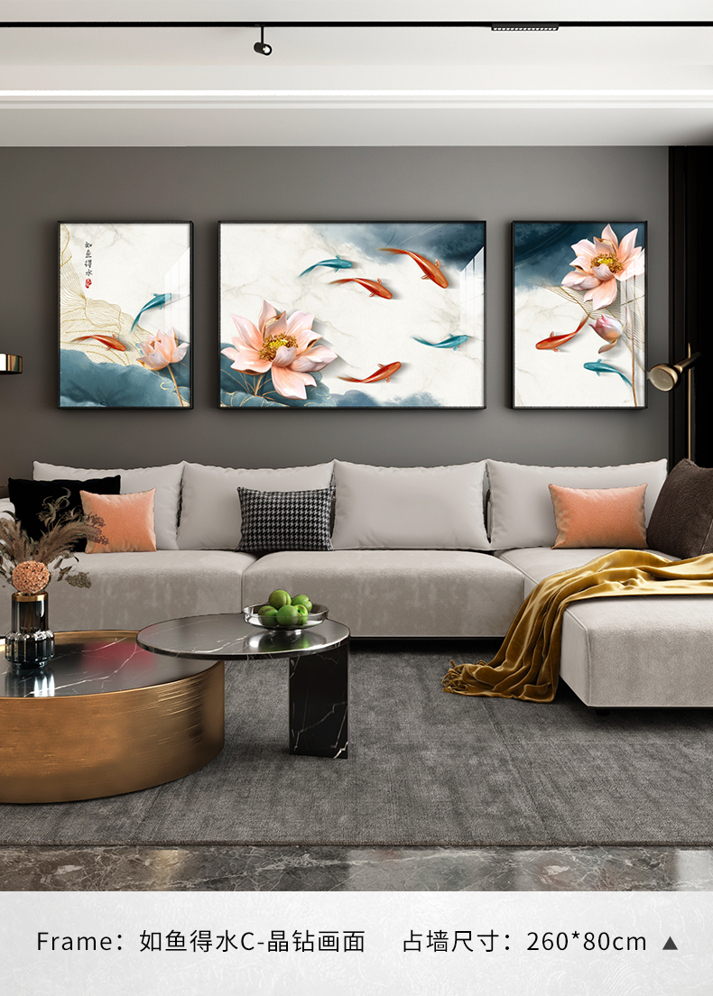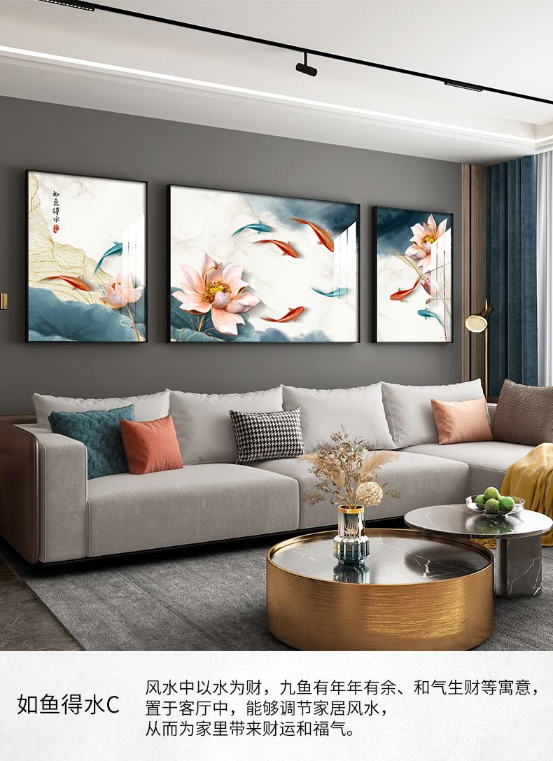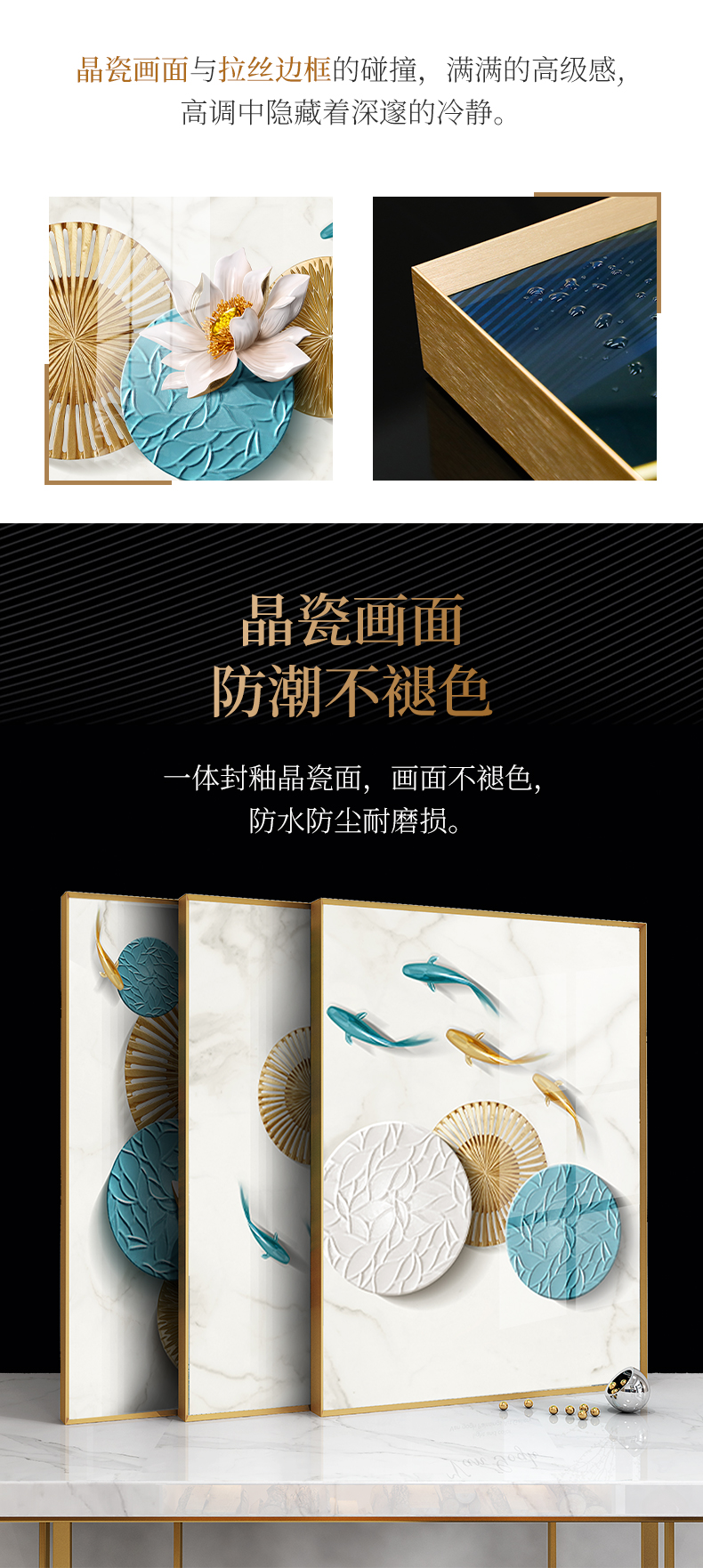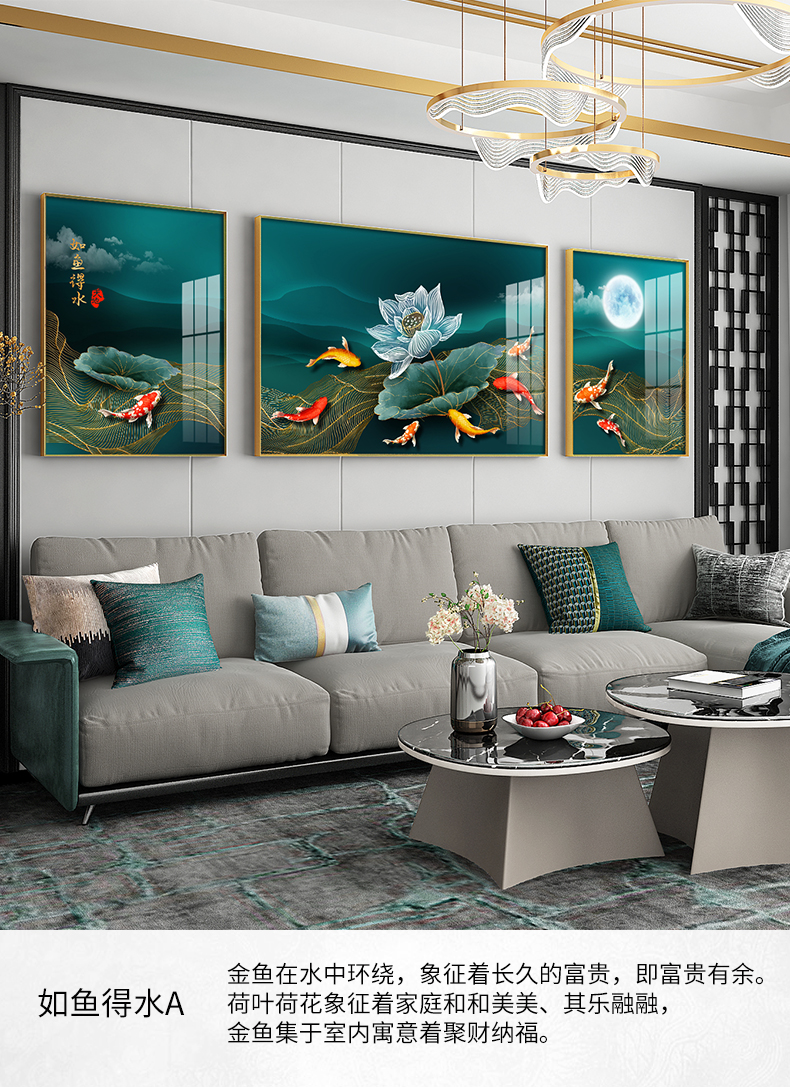 紀恒ふんわり9魚図リビングの背景壁にハイエンドの大気ソファを飾った後、壁の壁画の新しい中国式蓮の花水晶を焼き、磁器のドリルを三連に描いた。現代の軽奢で、穴を開けずに壁に描かれたのは魚の水を得たようなものだ。金縁(晶磁の画面)は40*60+中60*80ぐらいです。