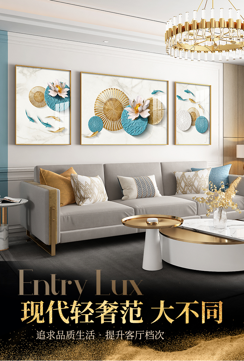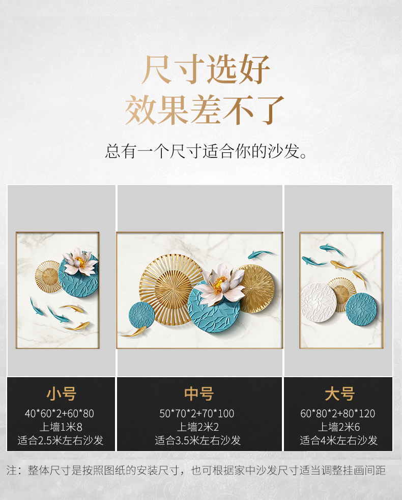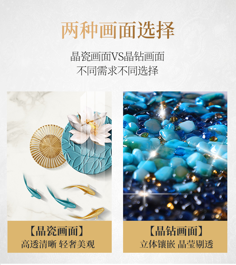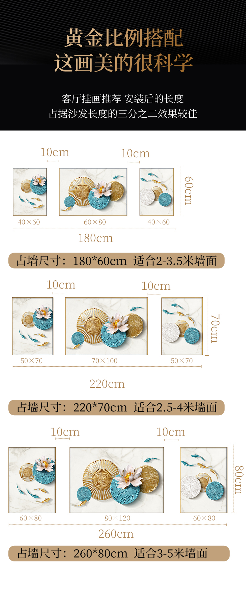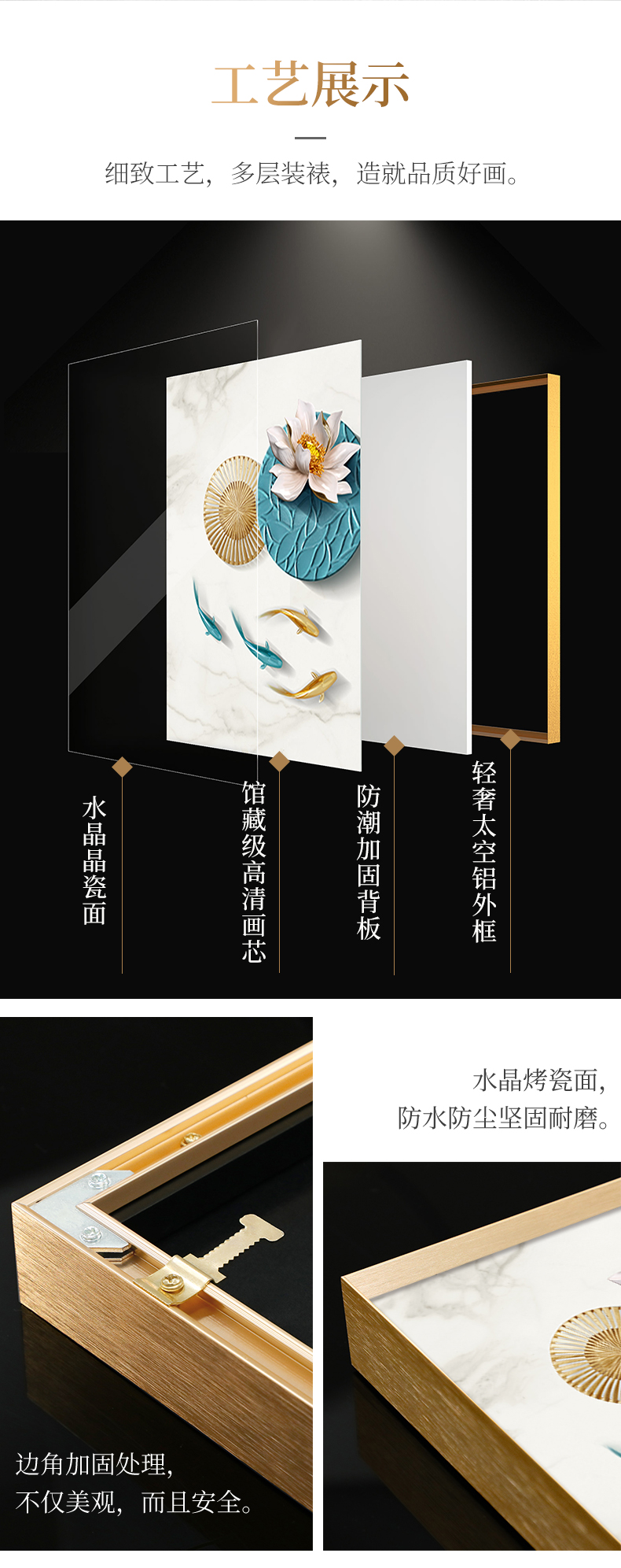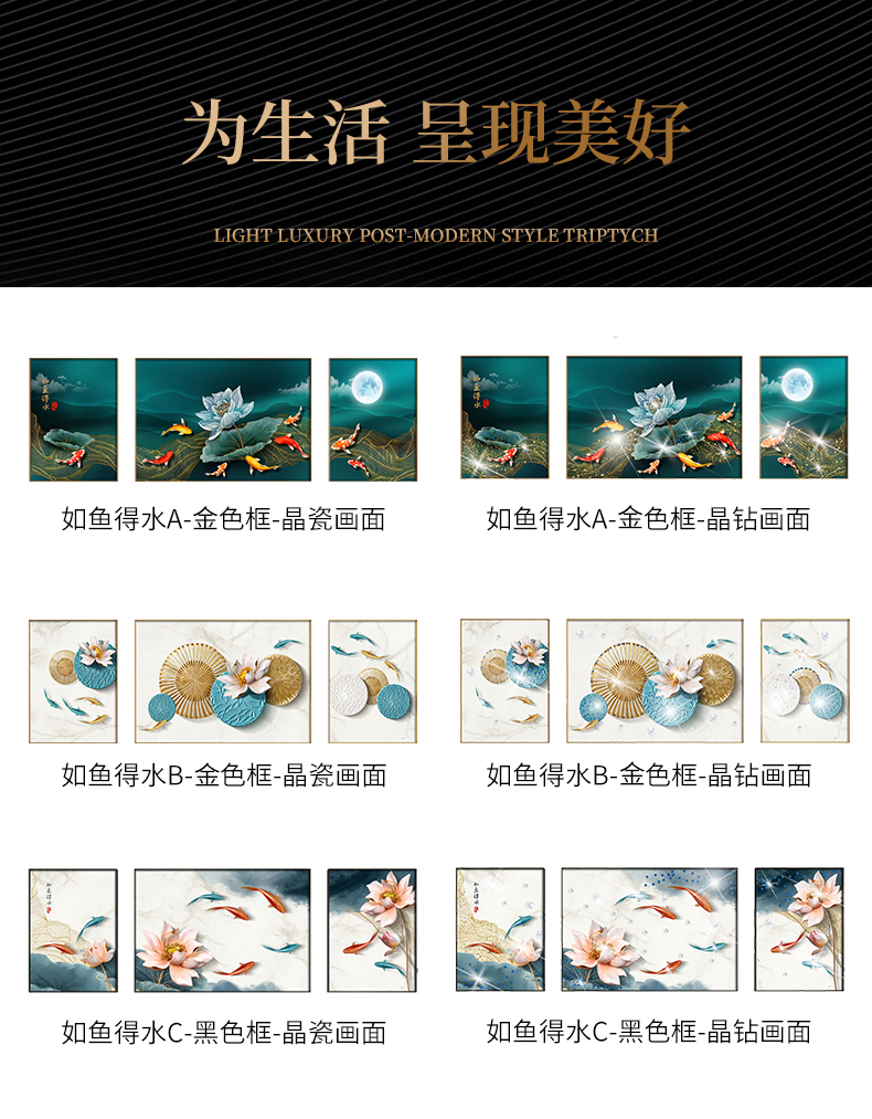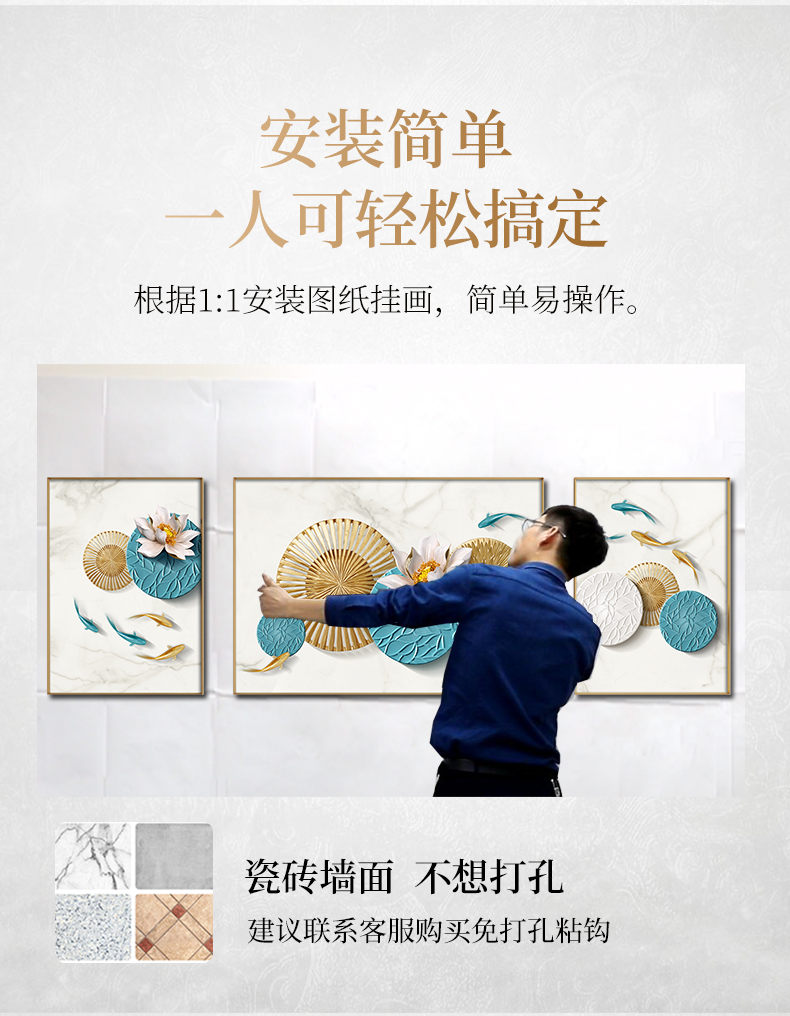 紀恒ふんわり9魚図リビングの背景壁にハイエンドの大気ソファを飾った後、壁の壁画の新しい中国式蓮の花水晶を焼き、磁器のドリルを三連に描いた。現代の軽奢で、穴を開けずに壁に描かれたのは魚の水を得たようなものだ。金縁(晶磁の画面)は40*60+中60*80ぐらいです。
