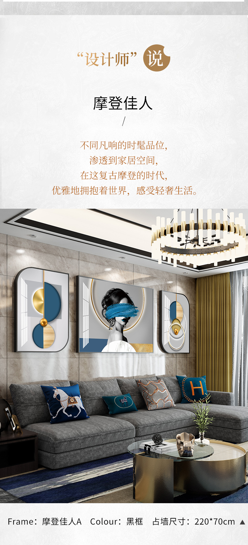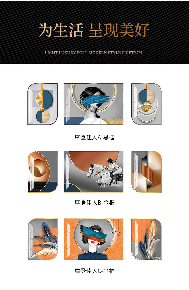 商品名称紀恒ふわふわリビングのソファーの背景壁の装飾画現代簡約ハイエンド大気北欧掛画の軽豪華で高級な晶磁画のアイデア抽象的な人物馬三連の壁画は穴壁画A-黒枠-モダン佳人Aぐらい40*60+中60*80(2.5ぐらいのソファーに適しています)