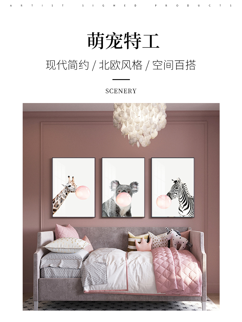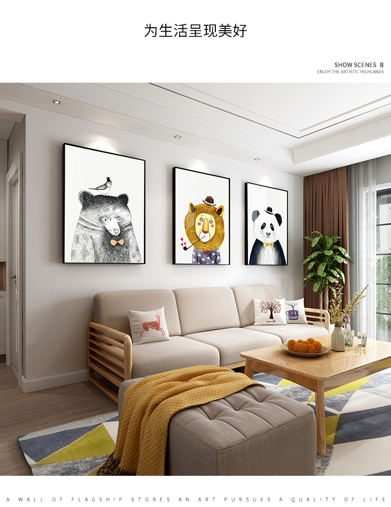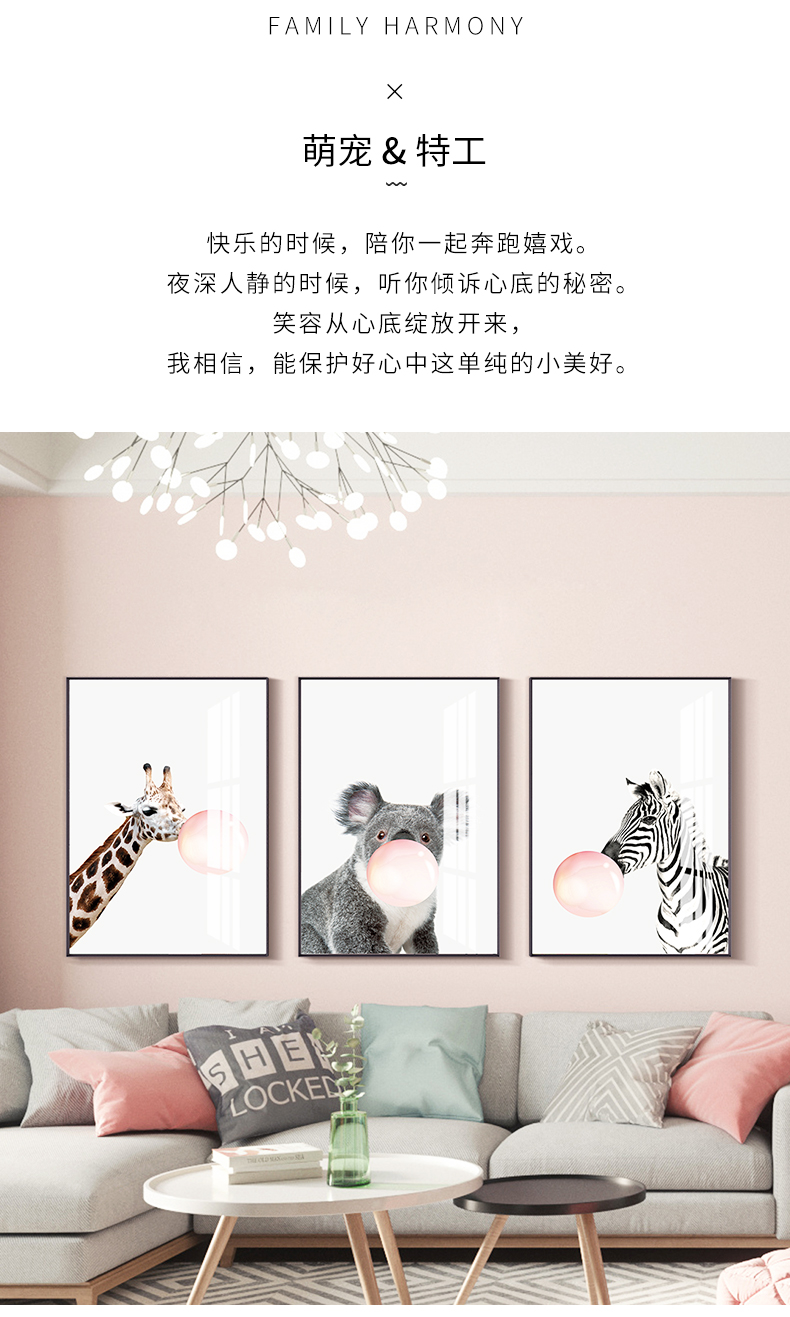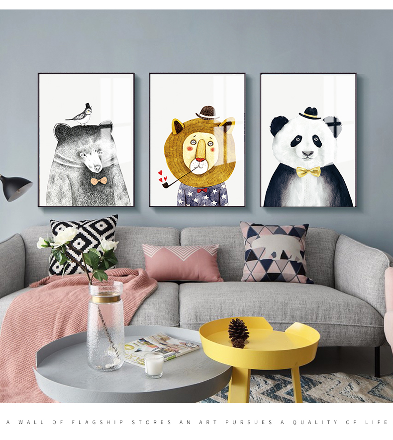 | 商品名称 | 紀恒軟北欧風アニメ装飾画リビングソファの背景壁壁画子供部屋小動物可愛い枕元掛画レストラン歺庁寝室の歩き方創意的なファッション壁画三連A-黒い枠で泡を吹く動物40*60 cm(2メートルぐらいのソファーに適しています) |