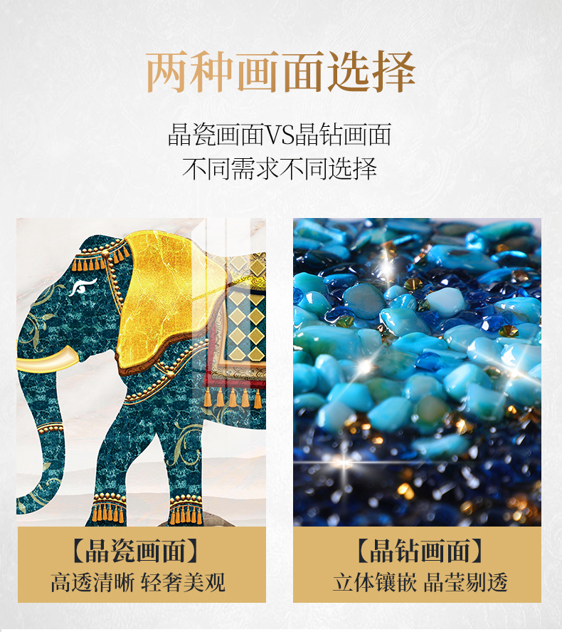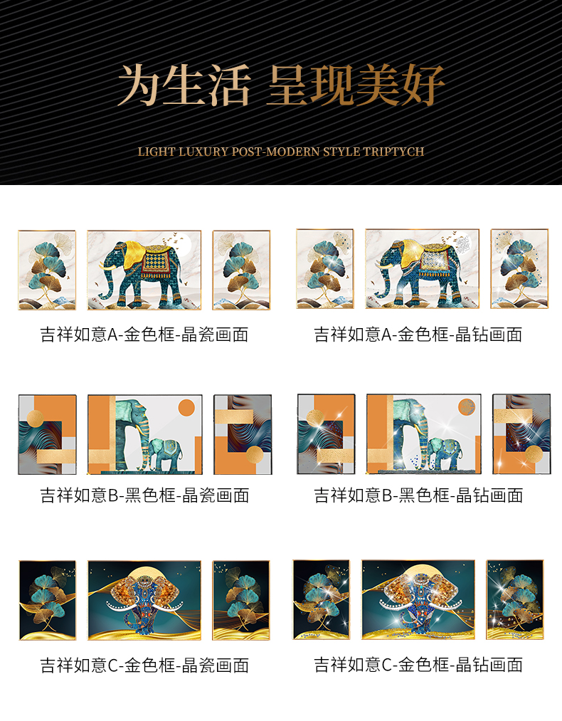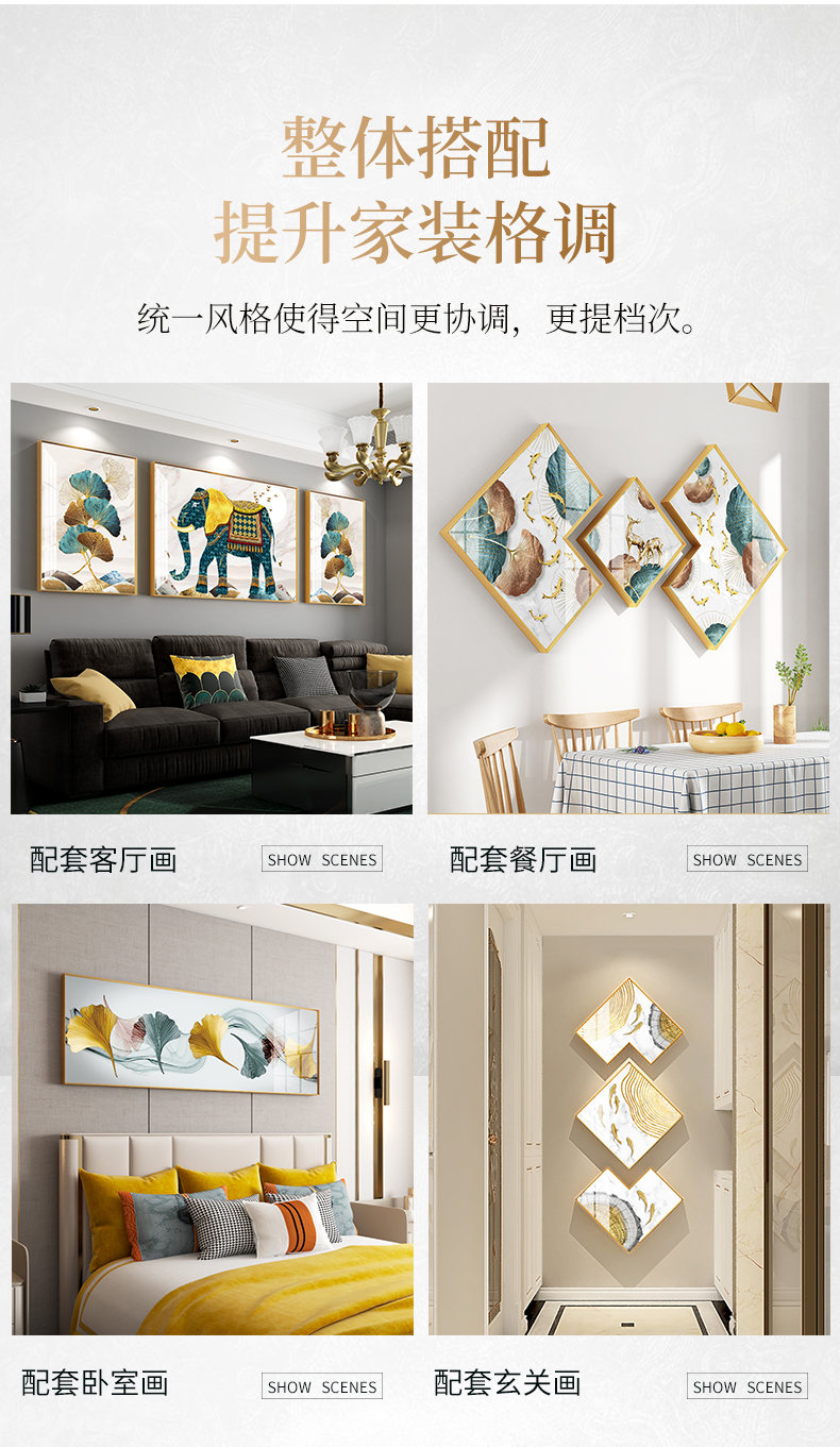 | 商品名称 | 紀恒ふわふわ象装飾画客間のソファーの背景壁壁画現代軽奢晶磁器三連画の簡単な大気抽象的な掛画ソフト内装無料打孔テレビの壁に掛けられた壁画の吉祥如意A-金色枠(晶磁画面)の左右40*60+中60*80(2.5ぐらいのソファーに適しています) |