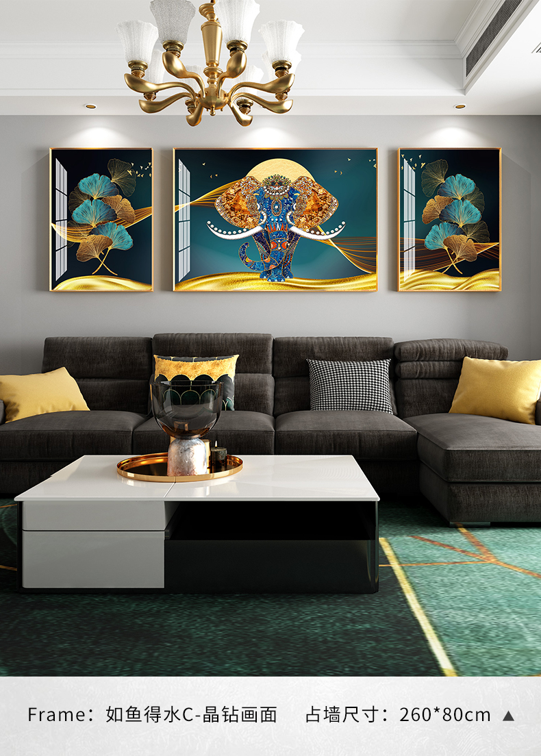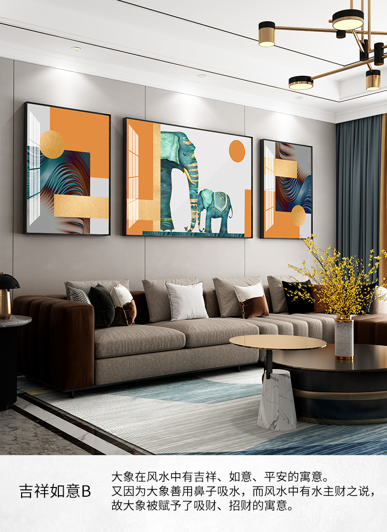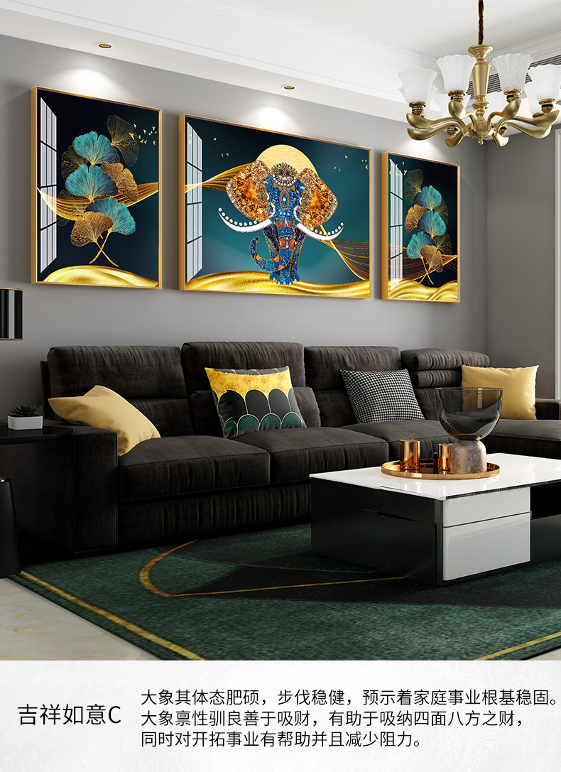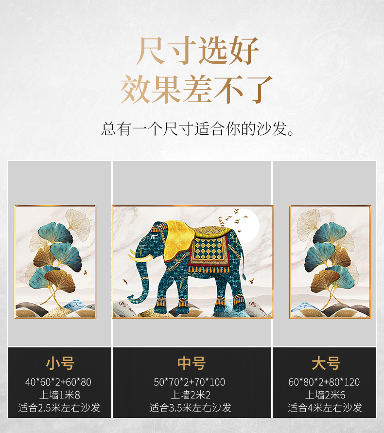 紀恒ふわふわ象装飾画客間のソファーの背景壁壁画現代軽奢晶磁器三連画は簡単な大気抽象画を描いて、家庭用ソフトアクセサリーの無料打孔テレビの壁に掛けた壁画は吉祥如意A-金色枠(晶磁画面)の左右40*60+中60*80(2.5ぐらいのソファーに適しています。)