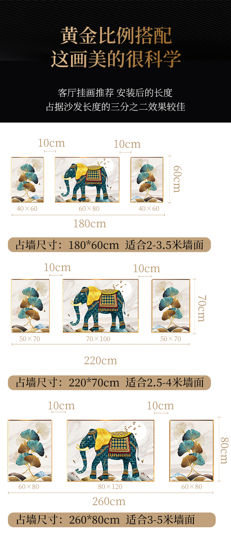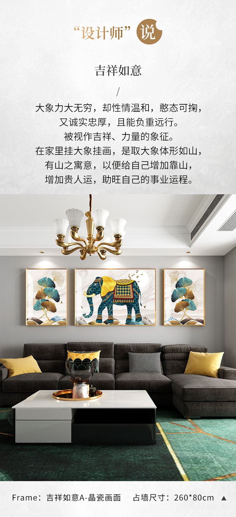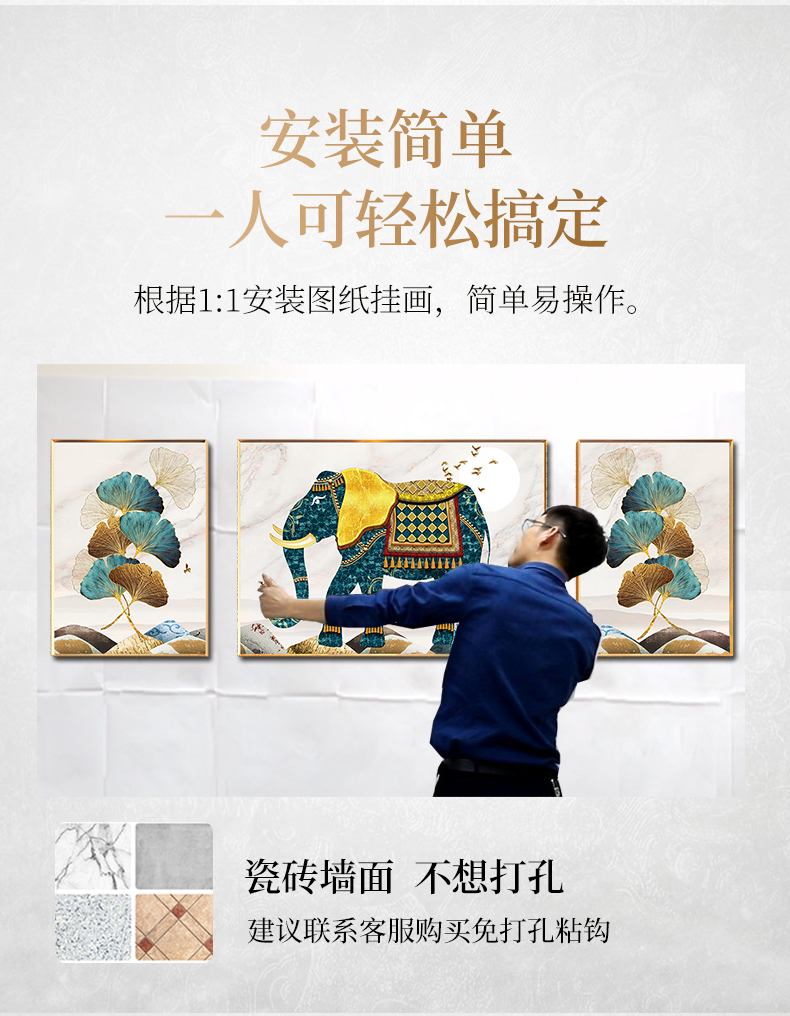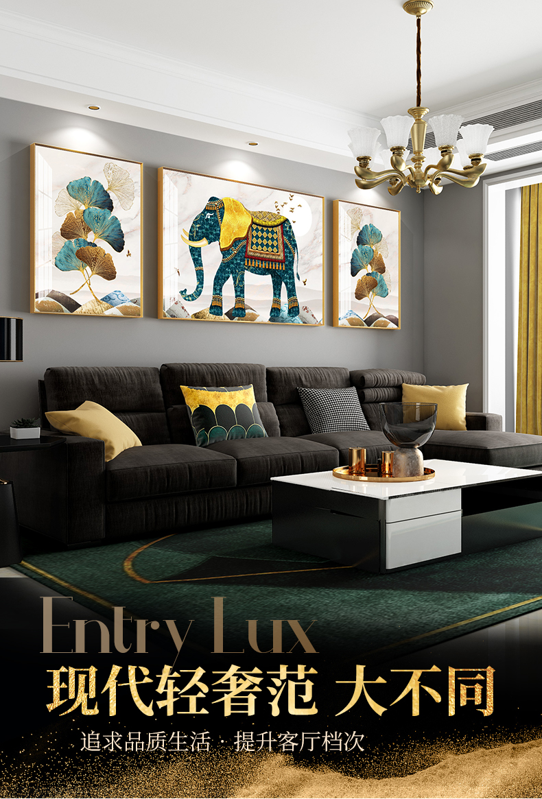 紀恒ふわふわ象装飾画客間のソファーの背景壁壁画現代軽奢晶磁器三連画は簡単な大気抽象画を描いて、家庭用ソフトアクセサリーの無料打孔テレビの壁に掛けた壁画は吉祥如意A-金色枠(晶磁画面)の左右40*60+中60*80(2.5ぐらいのソファーに適しています。)
