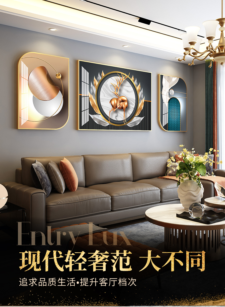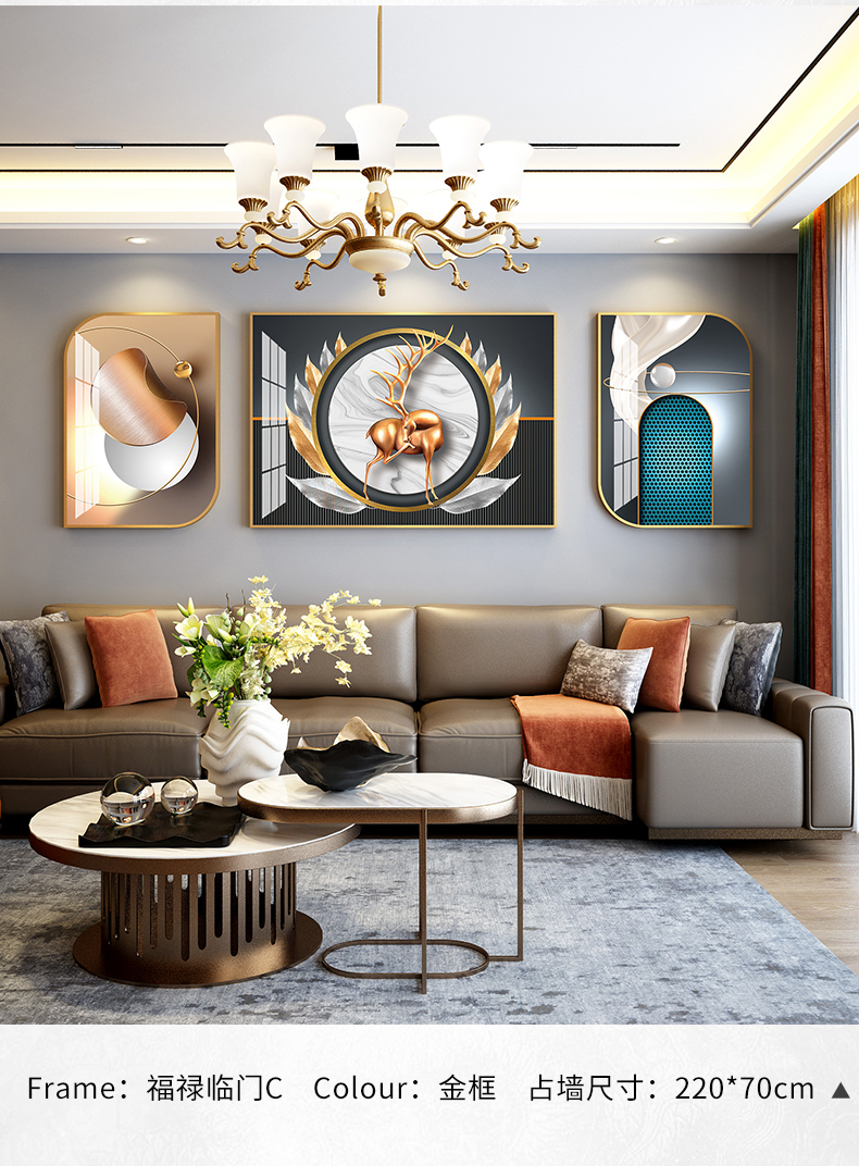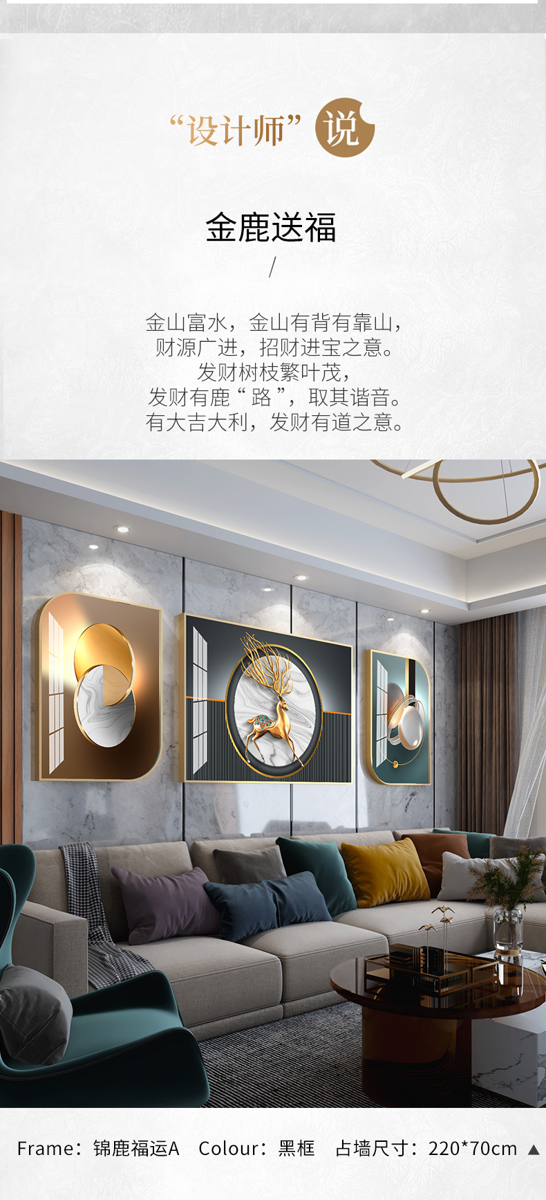 紀恒軟らかいソファーの背景壁装飾画客間壁のムーブメント現代簡単で豪華な三連晶磁器画の高級な大気抽象的な家庭装飾ソフト別荘の壁画の穴あけなし壁画A-黒い枠-錦鹿福運ぐらい40*60+中60*80(2.5ぐらいのソファーに適しています)
