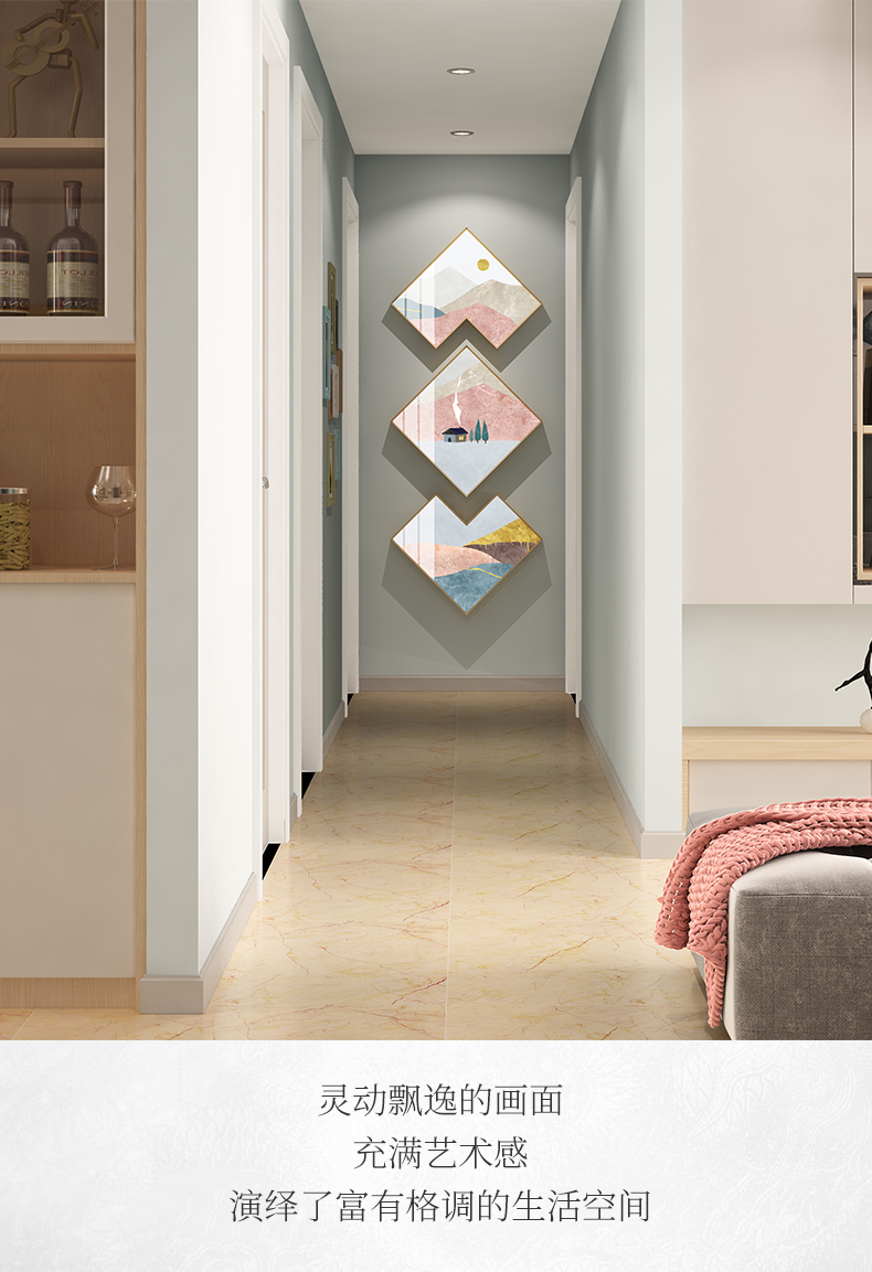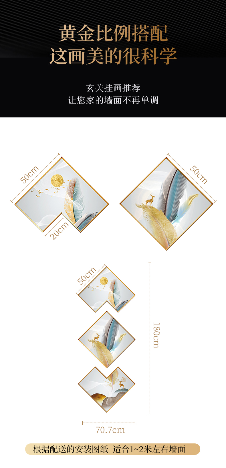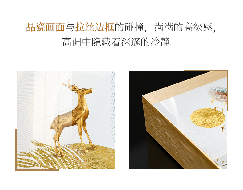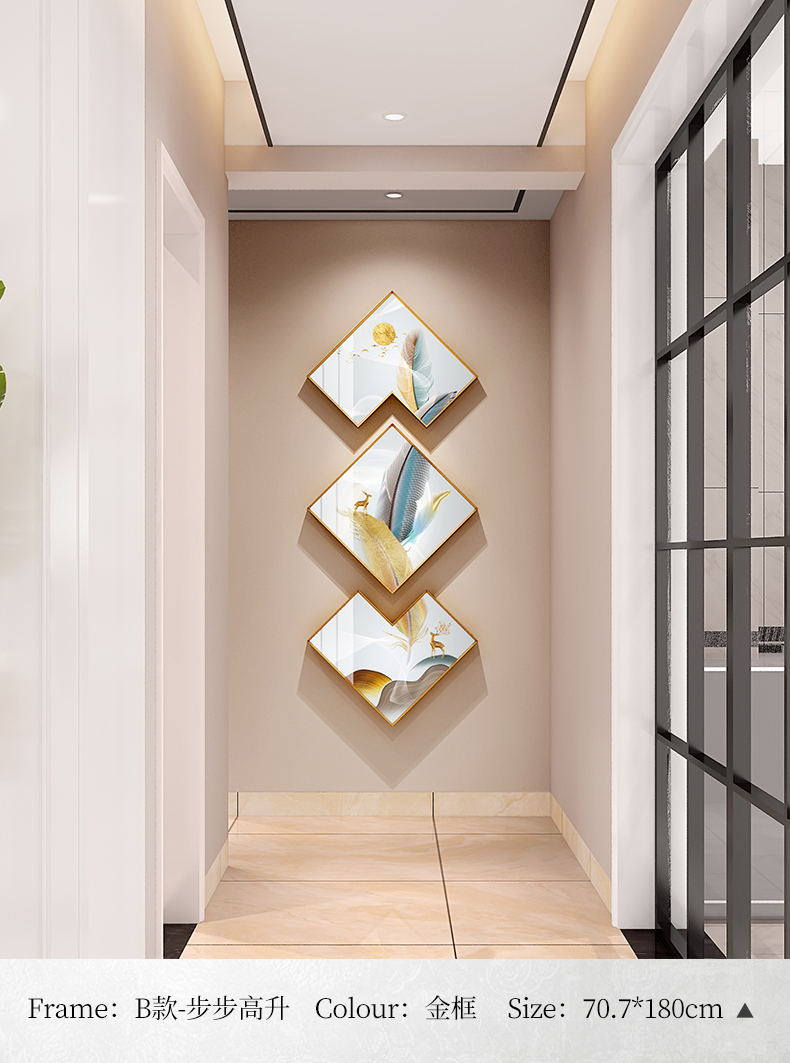 紀恒の暖かい玄関に入ると、現代のライトで豪華な装飾画が施された磁器画の大気セットの掛け軸が描かれていて、家相を招きます。鹿は廊下の抽象的な背景の壁に沿って、B-歩調が高くなります。金色の枠は壁のサイズを占めます。幅70.7 cm*高さ180 cmです。