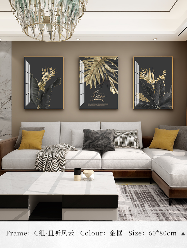 紀恒ふわふわ抽象芸術客間の背景壁装飾画現代簡約ソファーの後ろの掛画晶磁画三連画は穴を開けずに描きます。北欧創意軟装壁画大気壁画C-しかも風吟を聞きます。金色枠60*80 cm(3.5メートルぐらいのソファーに適しています。)