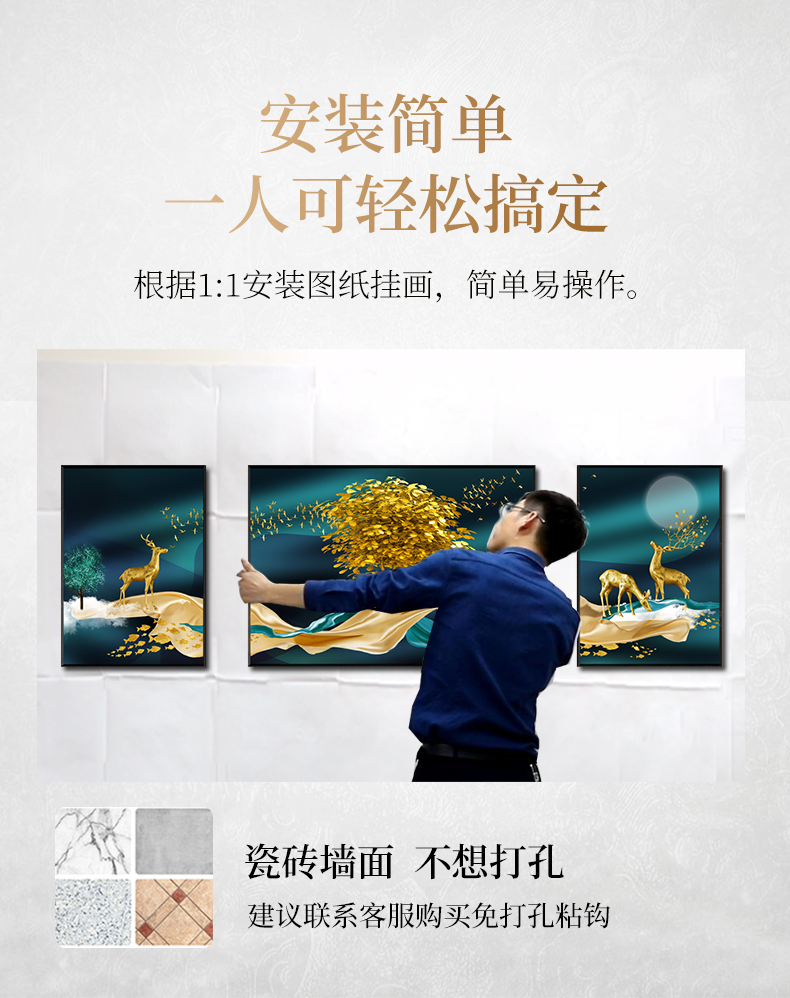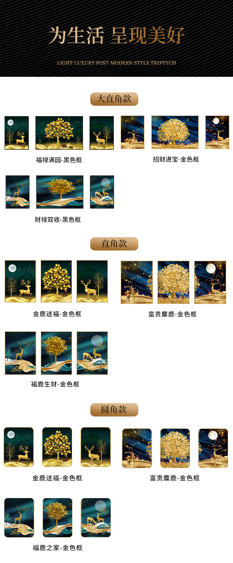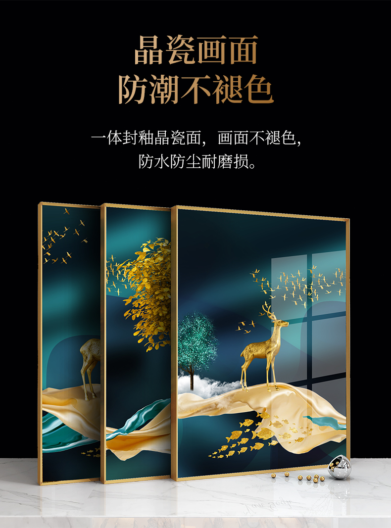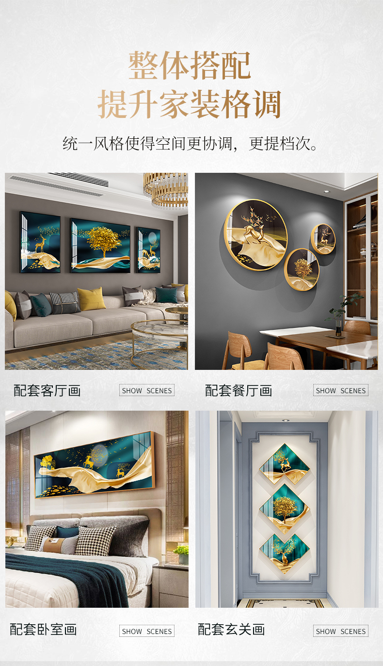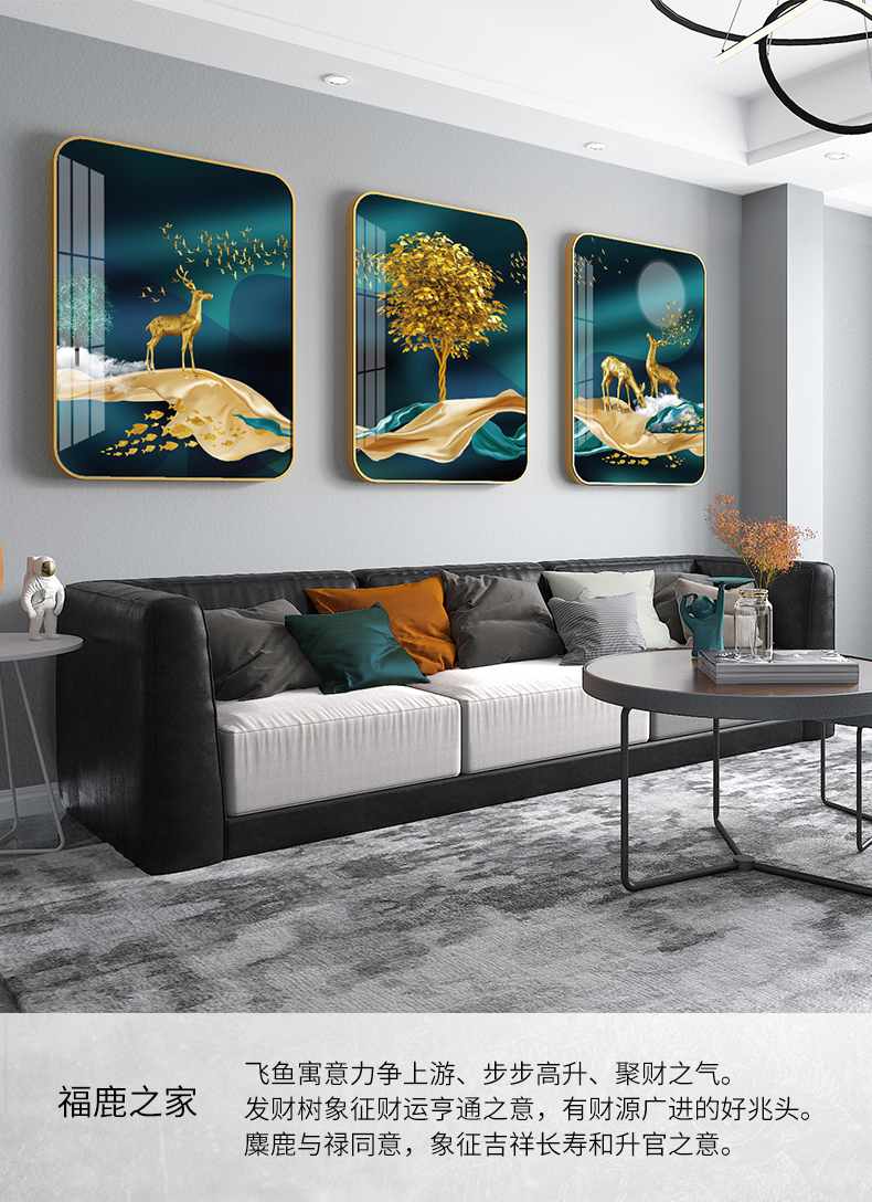 | 商品名称 | 紀恒軟客間の背景壁には、軽くて豪華な現代三連が描かれています。ソファーを掛けた後、壁の上にあるトナカイの発達した壁画は、簡単で高級な超大型壁画で、大気が良いという意味で描かれています。 |