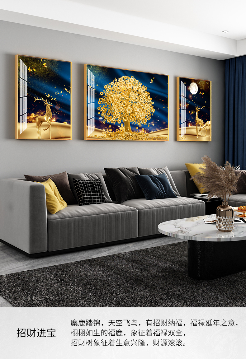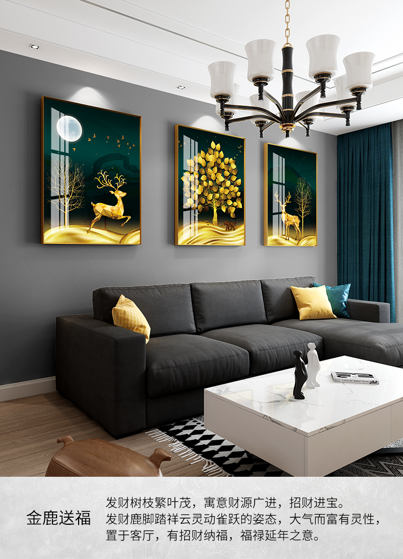 紀恒軟らかいリビングの背景壁に、軽くて豪華な現代三連がソファを描いた後、壁に設置されたトナカイの発達した木の壁画は、簡単で高級な超大型の壁画で、大気が良いという意味で描かれています。