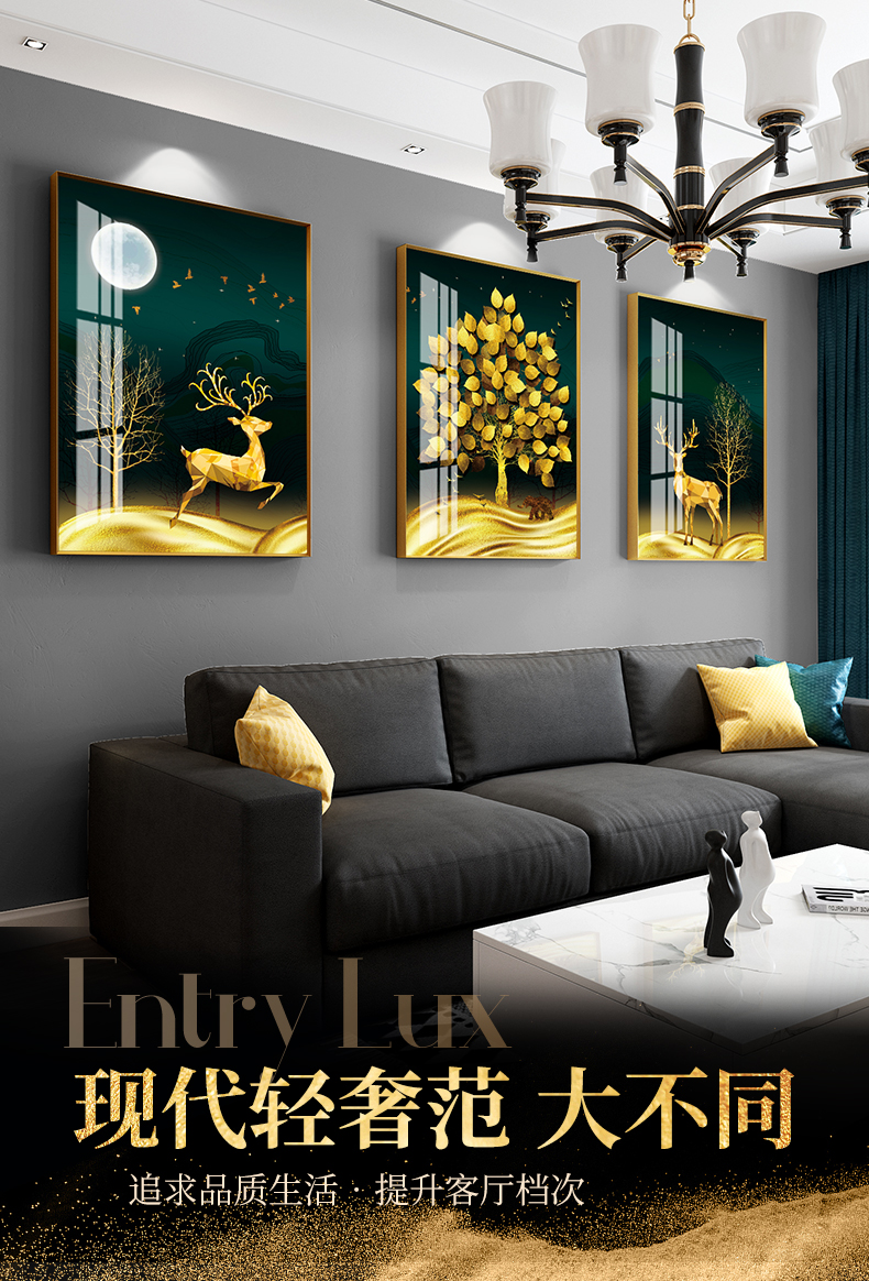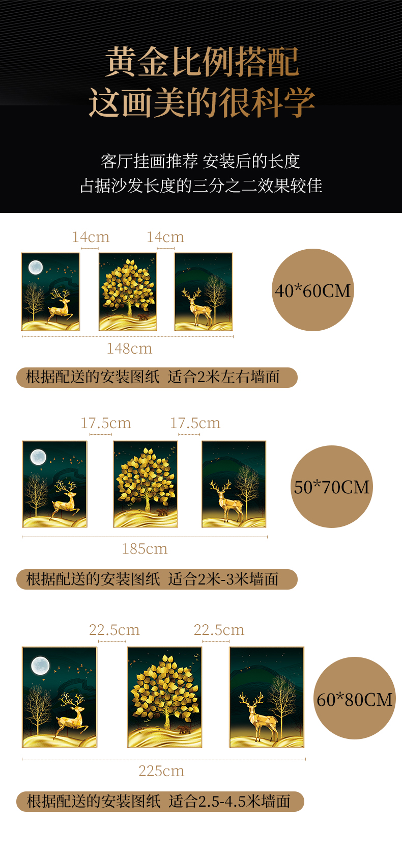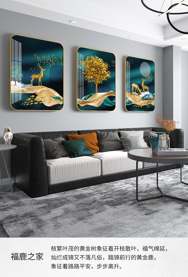 | 商品名称 | 紀恒軟客間装飾画ソファーの背景壁壁画新中国式招財のための鹿三連掛画家の別荘ソフト装飾壁画創意簡単現代晶磁器画壁画直角画-福鹿生財-金色枠60*80 cm(3.5メートルぐらいのソファーに適しています) |
