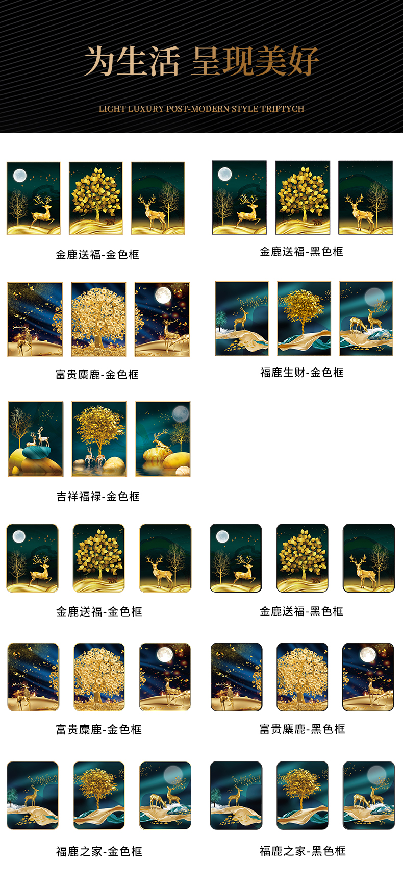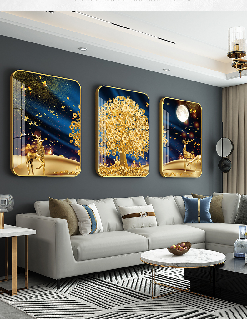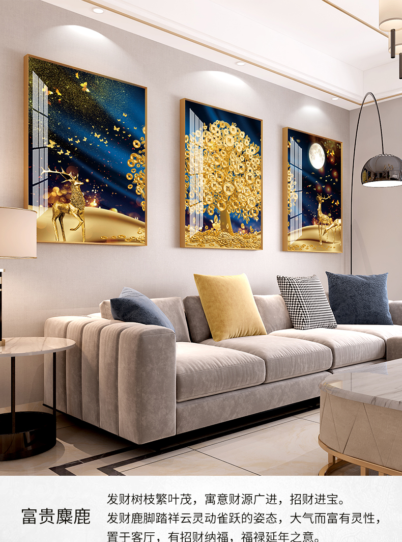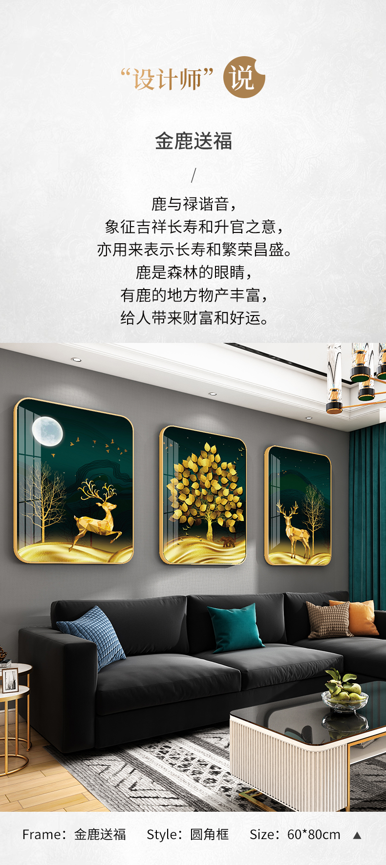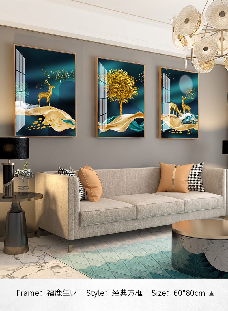 紀恒軟らかい客間装飾画ソファの背景壁壁画の新中国式招财のため、鹿三連は家の別荘を描いて、柔らかく壁を装飾する創意を簡潔にして、現代の晶磁画の壁に直角を描く。福鹿の生財。金色の枠60*80 cm(3.5メートルぐらいのソファーに適しています。)