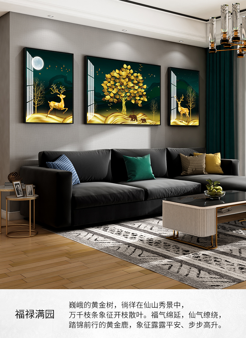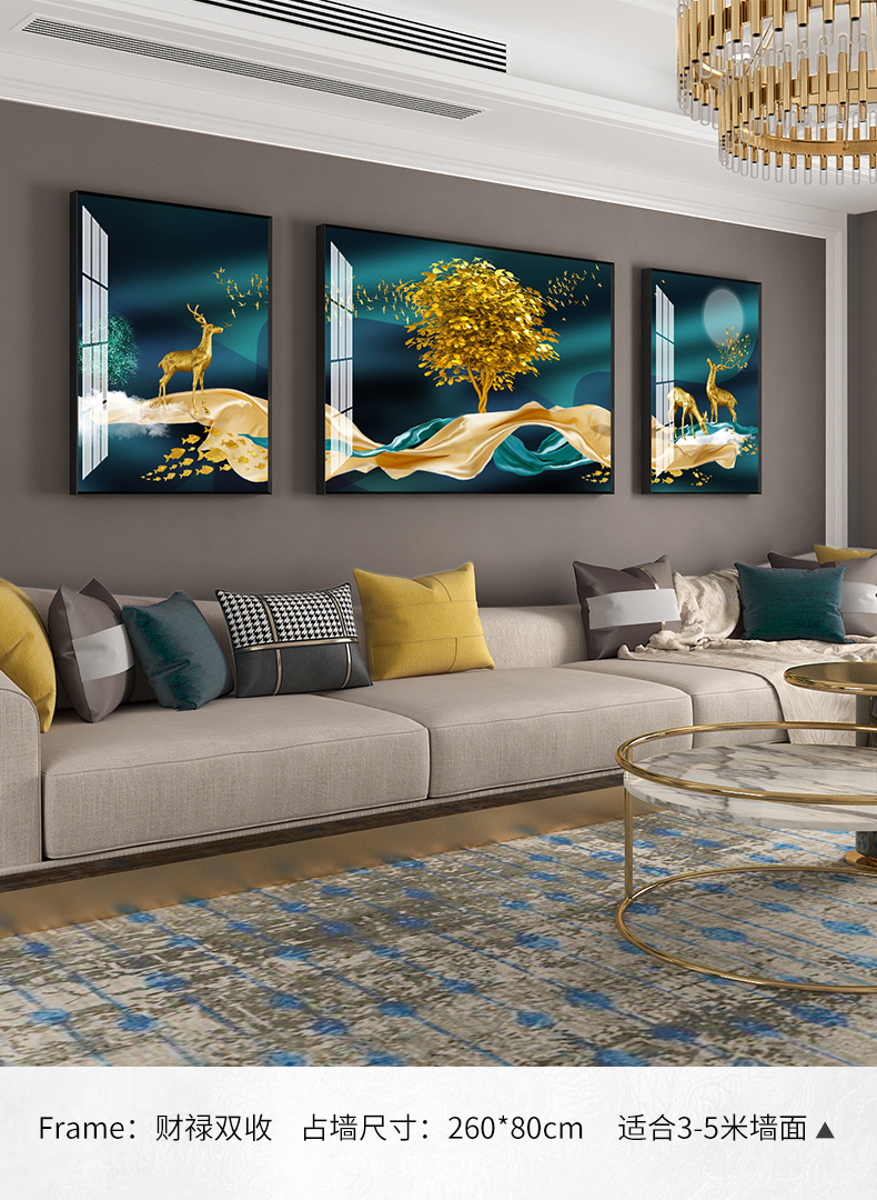 紀恒軟らかいリビングの背景壁に、軽くて豪華な現代三連がソファを描いた後、壁に設置されたトナカイの発達した木の壁画は、簡単で高級な超大型の壁画で、大気が良いという意味で描かれています。