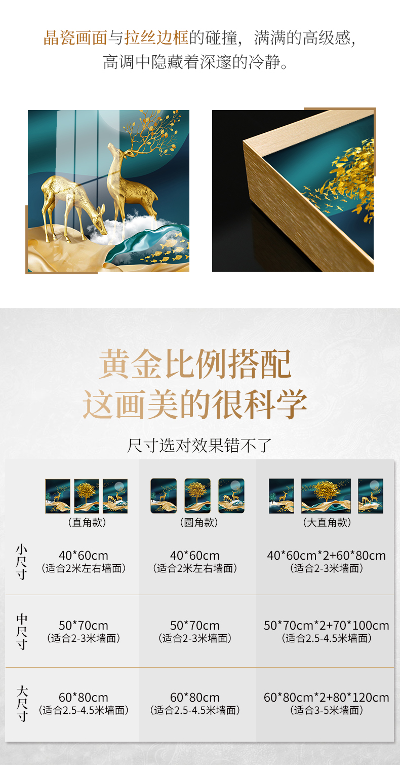| 商品名称 | 紀恒軟客間の背景壁には、軽くて豪華な現代三連が描かれています。ソファーを掛けた後、壁の上にあるトナカイの発達した壁画は、簡単で高級な超大型壁画で、大気が良いという意味で描かれています。 |