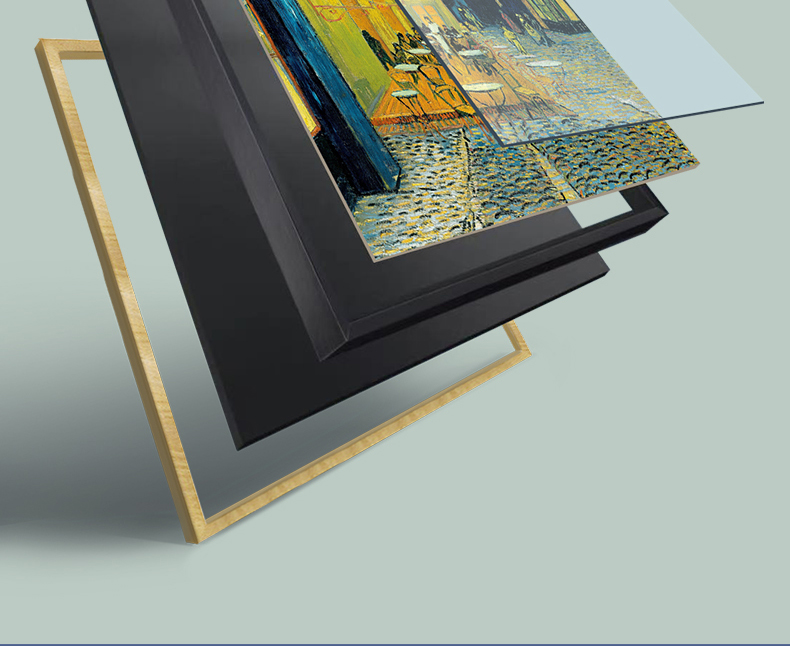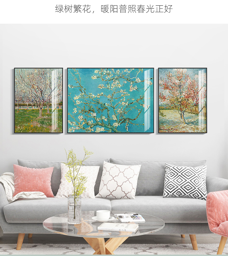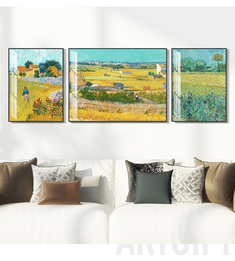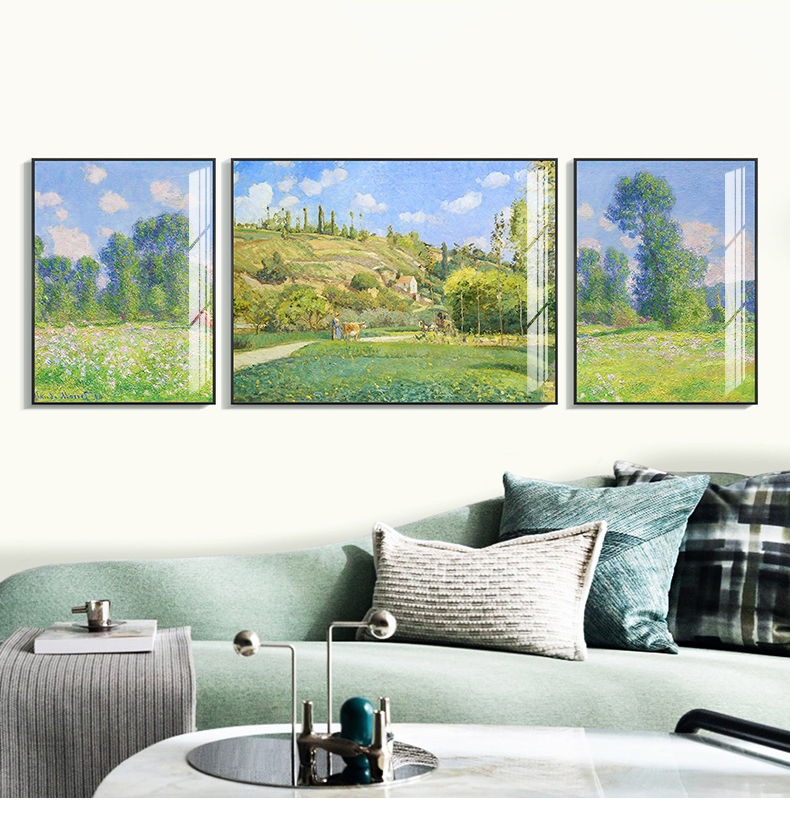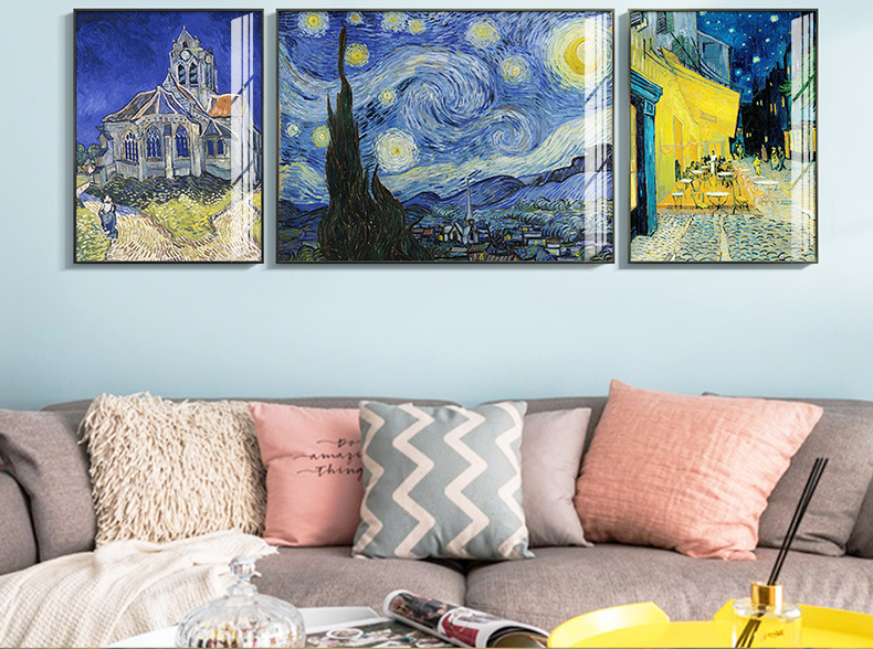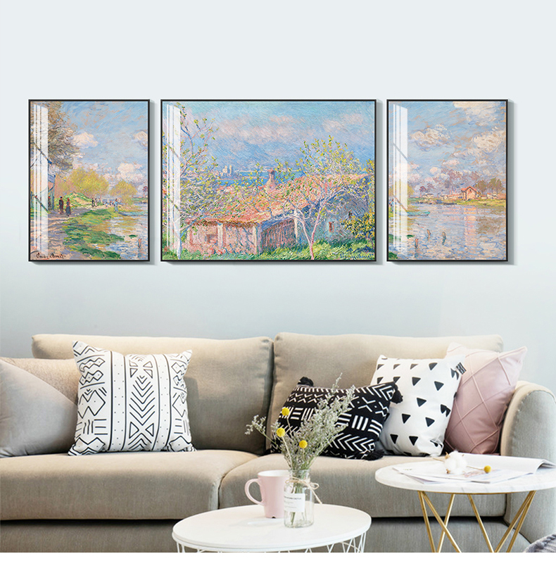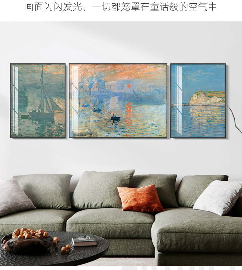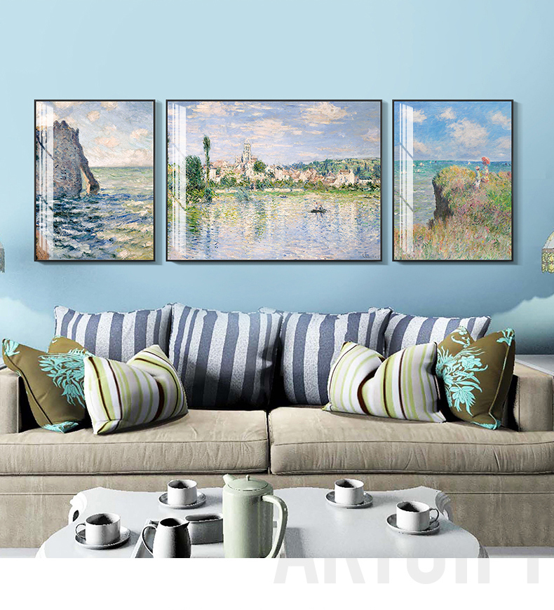 芸術家のプレゼント現代のライトルーム装飾画三連ソファの背景壁吊るすし絵ゴッホ油絵豊作の星空ひまわりモネ睡蓮大師名画レイストラン寝室壁画D-モネ-海辺風景L:両側70*50中央70*90【土豪金】