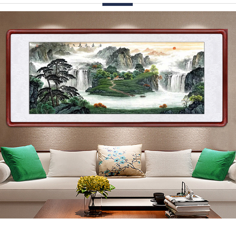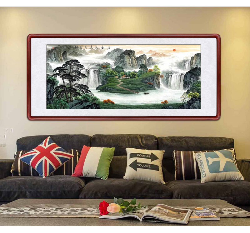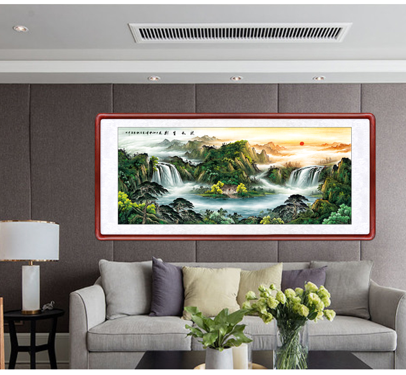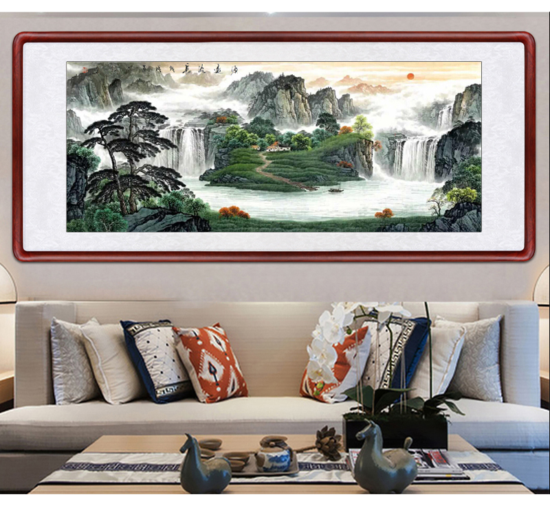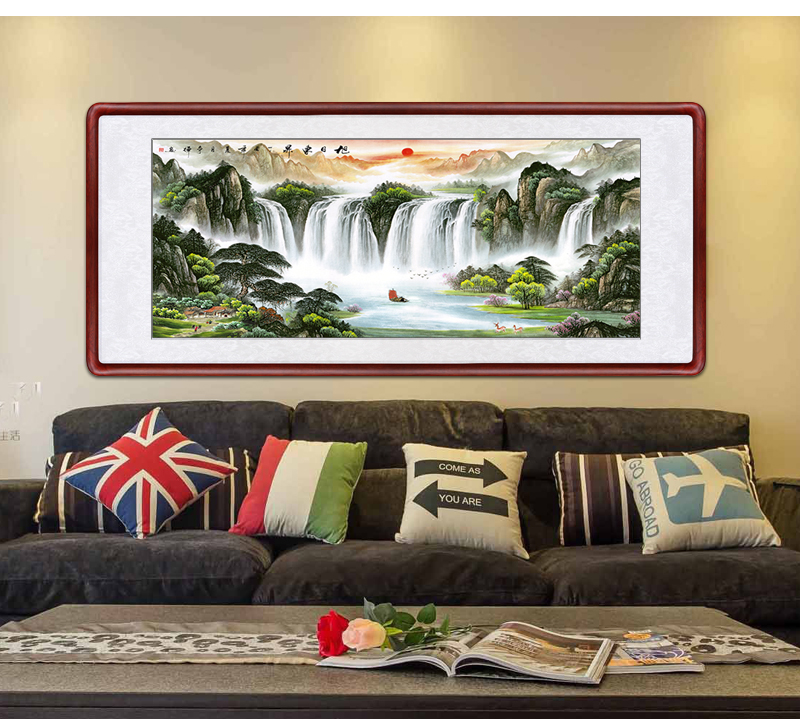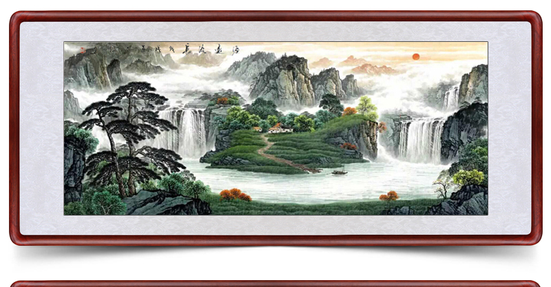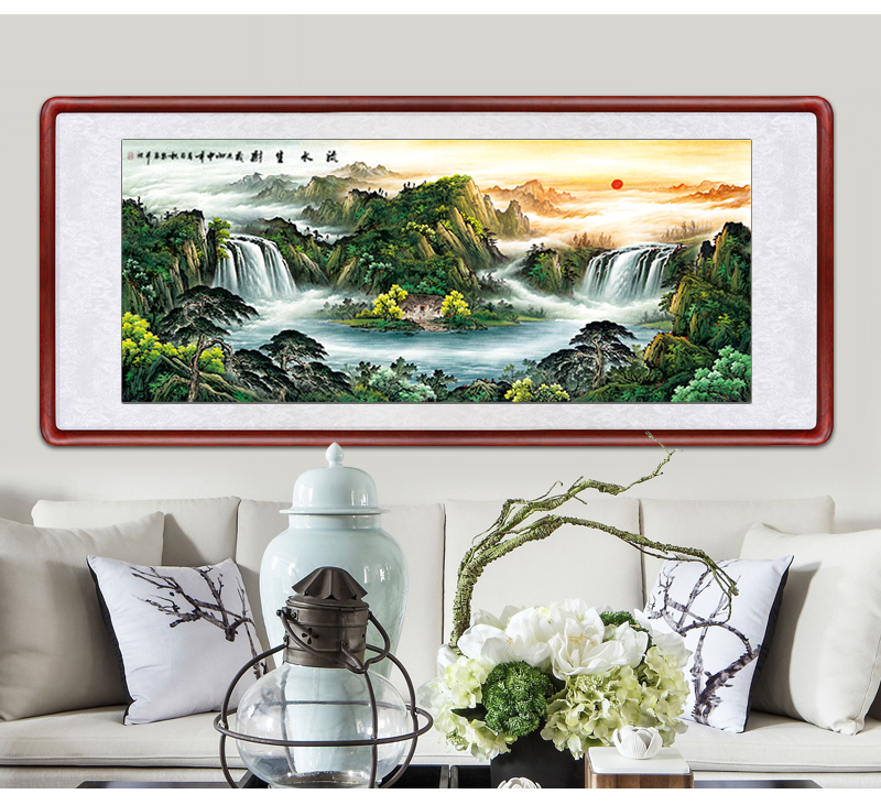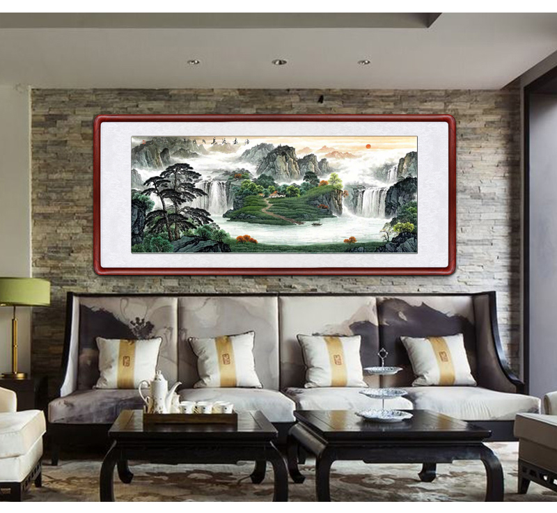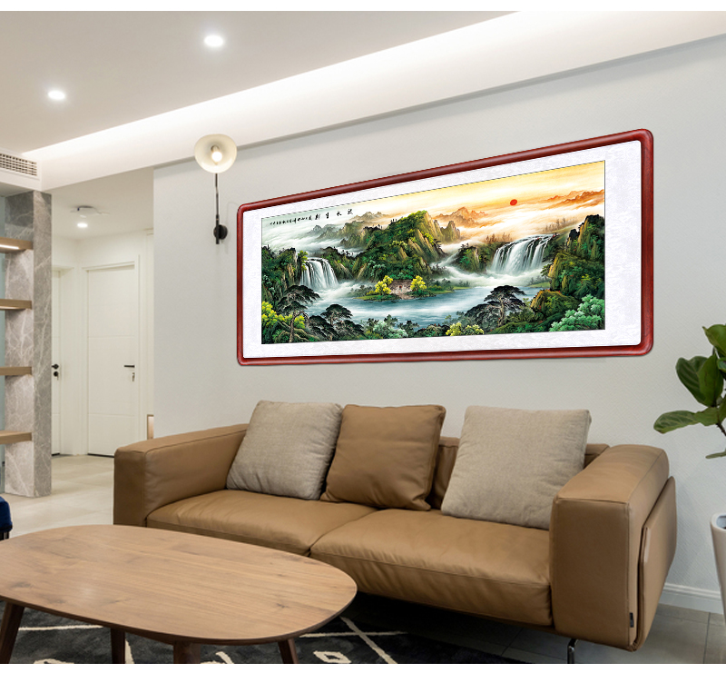 風景画リビング装飾画事務室吊り下げ絵招財旭日東昇国画集宝盆風水寄山図ソファー背景壁鴻運当頭壁画中式招財有枠水墨画a項旭日東昇83*163 cm(2.5メートル前後の壁面に適している)