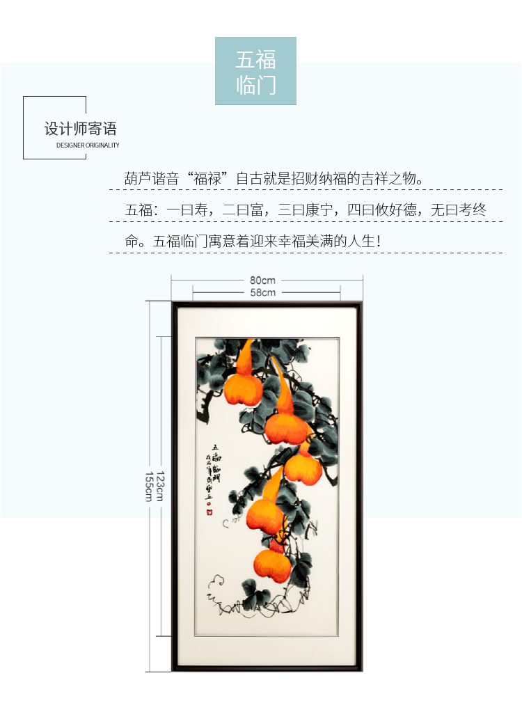| 商品名称 | 逸福瑞苏繍完成品吊げ絵福禄五福临门纯手工刺しゅう中国风波奇廊下装饰画新中式葫芦波奇刺繍画五福临门80*155 |